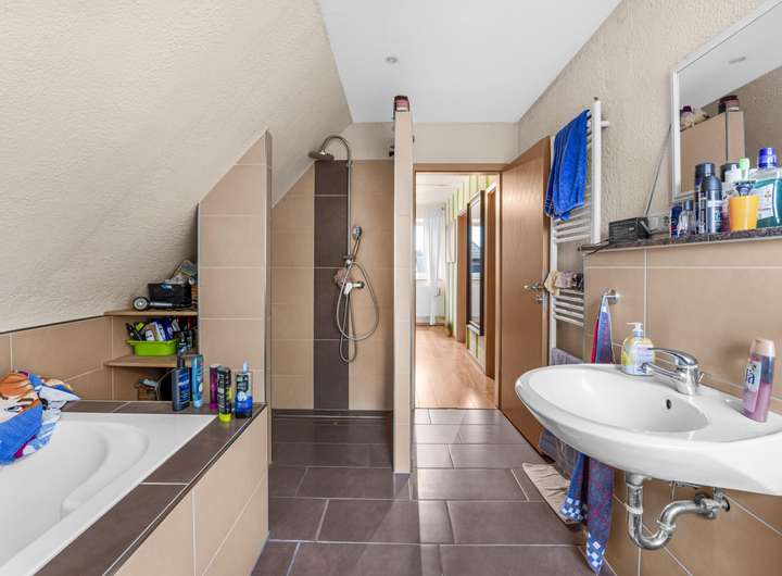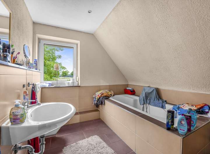 Das Haus verfügt über vier Zimmer, verteilt auf Erdgeschoss und ausgebautes Dachgeschoss. Der großzügige Wohn- und Essbereich mit Kamin bildet das Herzstück und öffnet sich zur sonnigen Terrasse – ein wunderbarer Ort für gemeinsame Stunden. Ein Gäste-WC im Erdgeschoss sowie drei weitere Zimmer und ein Badezimmer mit Dusche und Badewanne im Dachgeschoss ergänzen die gelungene Raumaufteilung. Stellplätze sind ebenfalls vorhanden und sorgen für eine komfortable Parksituation.