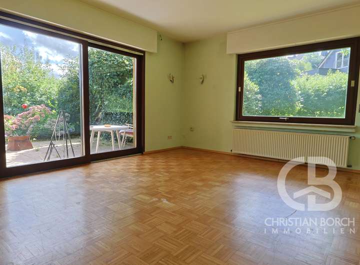 Die Einliegerwohnung mit separatem Eingang schafft völlige Unabhängigkeit und eignet sich hervorragend für verschiedene Lebenssituationen. Ein erwachsenes Kind oder die Eltern finden in der Wohnung ihr eigenes Reich mit Schlafzimmer, Wohnzimmer mit Ausgang auf die Süd-/ Ostterrasse, einer großzügigen Diele, Küche mit Einbauküche sowie ein Bad mit Wanne, Dusche und WC.