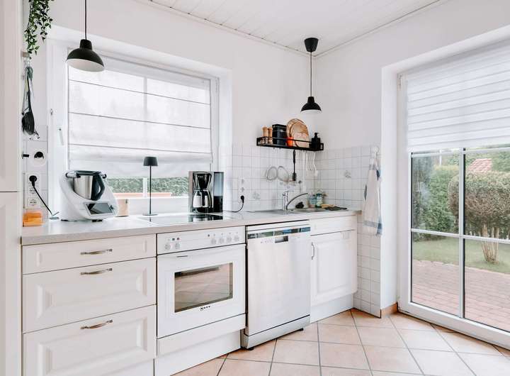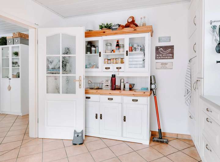 Die angrenzende Küche bietet viel Stauraum und ist ideal für die Zubereitung gemeinsamer Mahlzeiten.