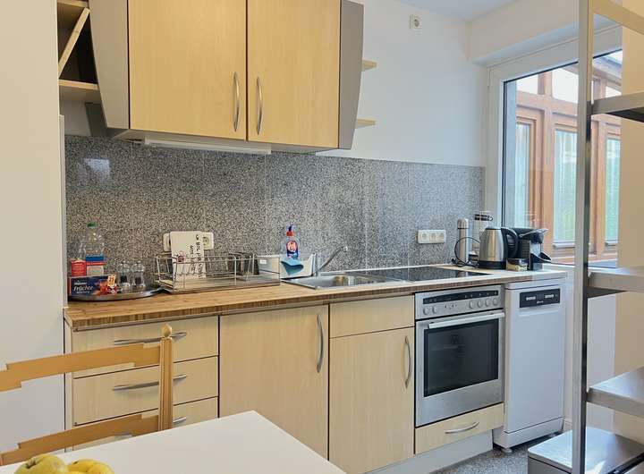 Die stilvolle, zeitlos gehaltene Einbauküche überzeugt nicht nur durch ihre Funktionalität, sondern auch durch ihre vollständige Ausstattung. Sie bietet alles, was man für den täglichen Gebrauch benötigt – angefangen bei Geschirr, Besteck, Töpfen und Pfannen bis hin zu praktischen Elektrokleingeräten wie Wasserkocher und Kaffeemaschine. Auch hochwertige Einbaugeräte wie Backofen, Kühlschrank und Spülmaschine sind selbstverständlich vorhanden.