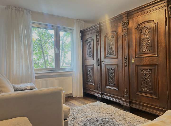 Die Möblierung umfasst einen großen Kleiderschrank aus Echtholz sowie eine passende Kommode, die reichlich Stauraum für Kleidung und persönliche Gegenstände bieten. Ein komfortables Queen-Size-Bett sorgt für erholsamen Schlaf, während ein zusätzliches Schlafsofa flexible Nutzungsmöglichkeiten schafft – sei es als Leseecke, Rückzugsort oder zusätzliche Schlafgelegenheit für Gäste.
