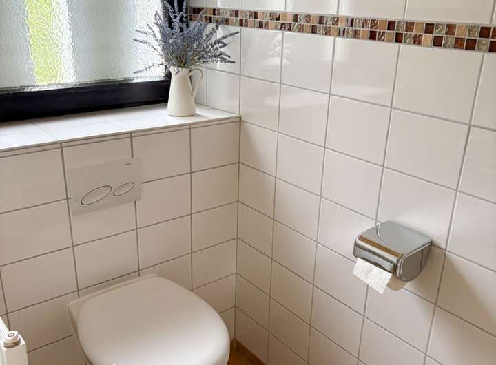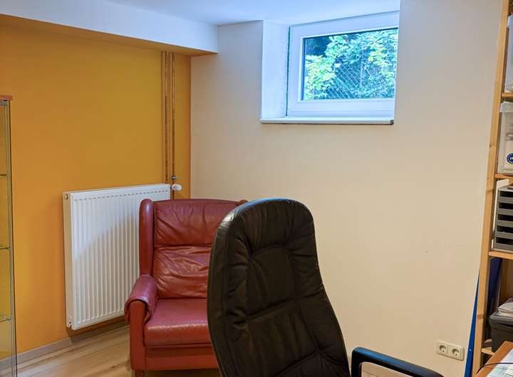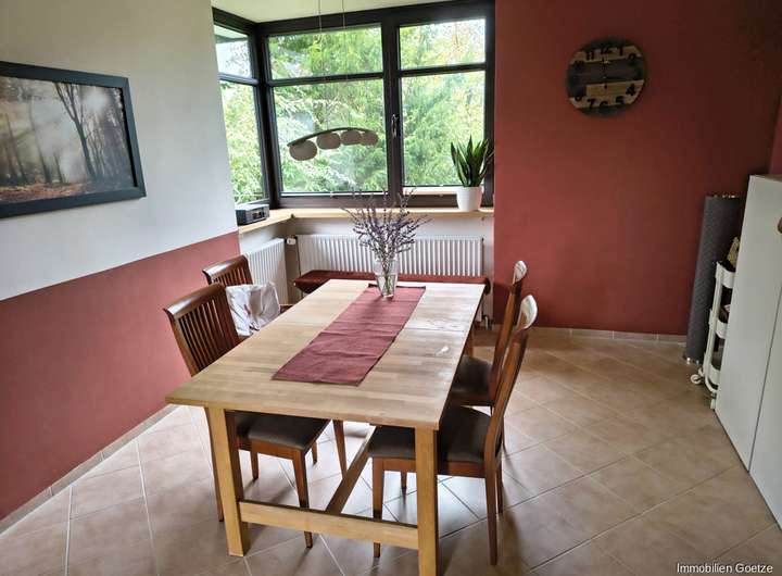 Bei dem Objekt handelt es sich um ein Architektenhaus mit einer durchdachten Grundrissgestaltung. Der Eingangsbereich umfasst einen Windfang und ein modernisiertes Gäste-WC. Vom zentralen Flur erschließen sich die Küche, das Esszimmer und das lichtdurchflutete Wohnzimmer mit Zugang zur Sonnenterrasse und damit zum Garten. Die großzügige Fensterfläche im Wohnzimmer sorgt für eine helle Atmosphäre. Ebenfalls vom Flur führen die Treppe ins Obergeschoss und in den Keller. Im Obergeschoss befinden sich mehrere Schlafzimmer, von einem führt der Zugang zu einem überdachten Balkon. Weiterhin vorhanden sind ein modernisiertes Hauptbad, ein Gäste-Bad mit Dusche sowie ein Arbeitszimmer. Die Kellerfläche bietet zusätzlichen Nutzraum in Form eines Gästezimmers und eines Büros. Zur technischen Ausstattung zählen eine Drainage-Pumpe, ein verrohrter Schornstein und kleine Heizkörper im Wohnzimmer. Die Wohnbereiche und Fenster wurden in den letzten Jahren umfassend modernisiert. Das Anwesen verfügt über einen gepflegten Garten mit Hecke als Sichtschutz zur Straße und Spielgeräten. Vor der Einzelgarage befinden sich zwei weitere Stellplätze. Der Ersteller des Energieausweises hat darauf hingewiesen, dass die Gebäudehülle sehr gut isoliert ist. Würde die alte Ölheizung beispielsweise durch eine Holzpelletheizung ersetzt, könnte sich die Energieeffizienzklasse von G auf A verbessern.