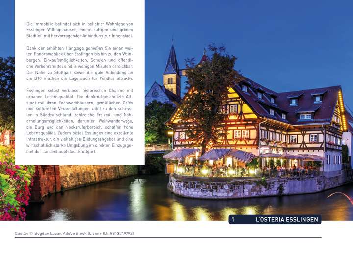 Dank der erhöhten Hanglage genießen Sie einen weiten Panoramablick über Esslingen bis hin zu den Weinbergen. Einkaufsmöglichkeiten, Schulen und öffentliche Verkehrsmittel sind in wenigen Minuten erreichbar. Die Nähe zu Stuttgart sowie die gute Anbindung an die B10 machen die Lage auch für Pendler attraktiv.
