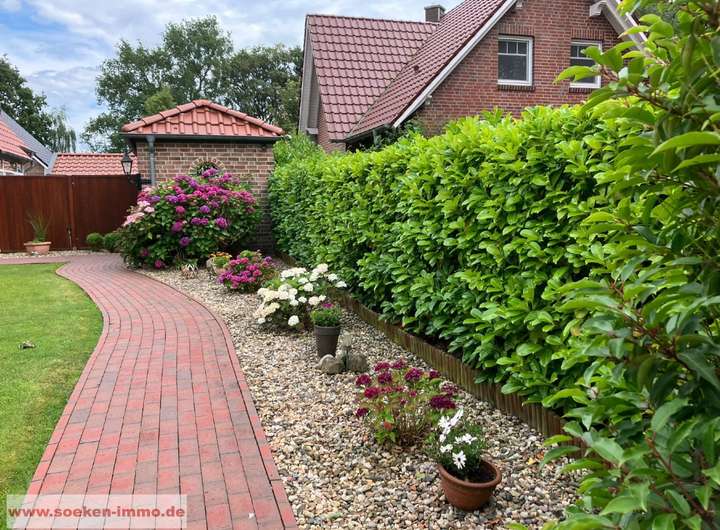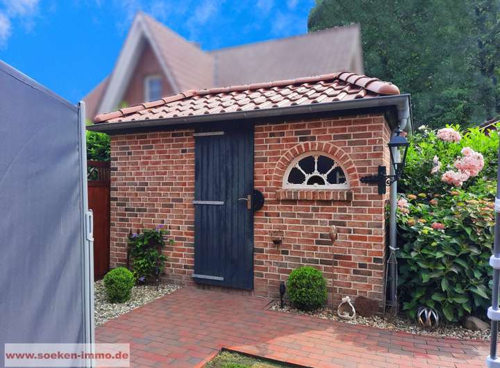 Sowohl über das Wohnzimmer wie auch den Hauswirtschaftsraum gibt es einen Zugang in den Garten und zur Terrasse. Im pflegeleicht angelegten Garten sticht der originell erstellte Schuppen ins Auge. Hier haben Sie Platz für Ihre Gartenmöbel und -geräte. Es ist ein KfZ Stellplatz vor der DHH vorhanden.