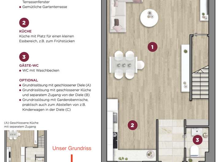 • Grundrissvariante mit 5 Zimmern, geschlossener Küche und Garderobennische