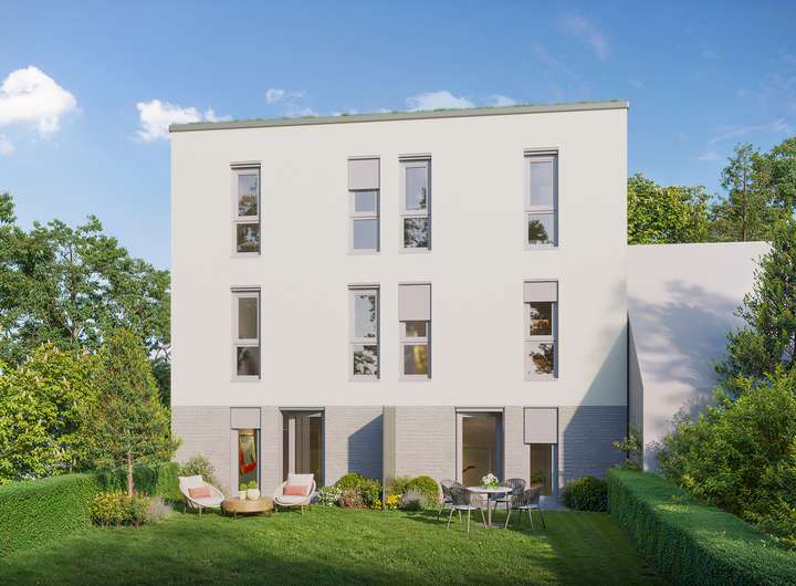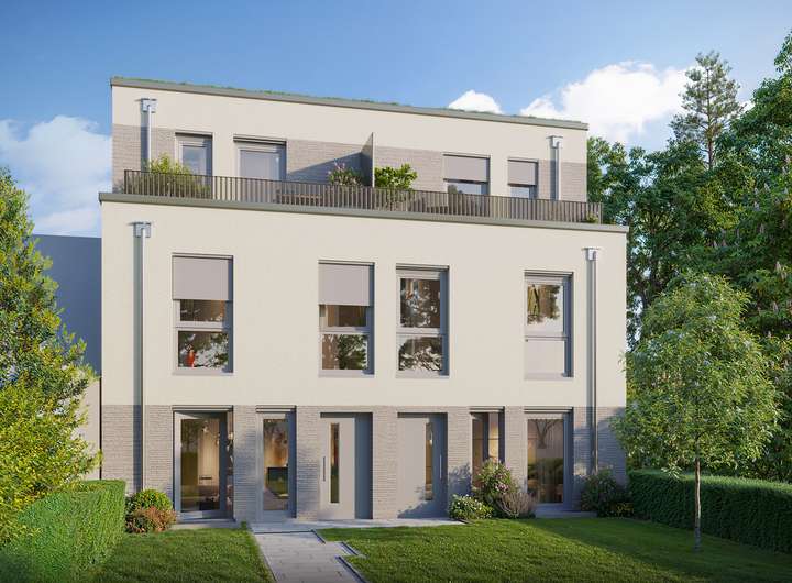 Bereits beim ersten Anblick überzeugt die moderne Fassade mit ihren klaren Linien. Die Stadthäuser im rückwärtigen Bereich haben einen diskreten Zugang durch den Garten, das Mehrfamilienhaus begrüßt mit einem eleganten Eingangsbereich und barrierearmen Zugängen.