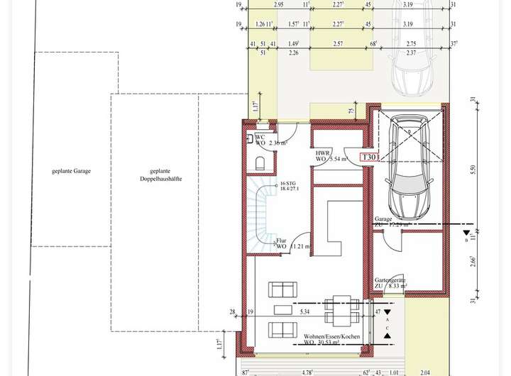 Eine Garage mit zusätzlichen Abstellraum ermöglicht den Zugang von der Straße in den Garten und zur Terrasse.