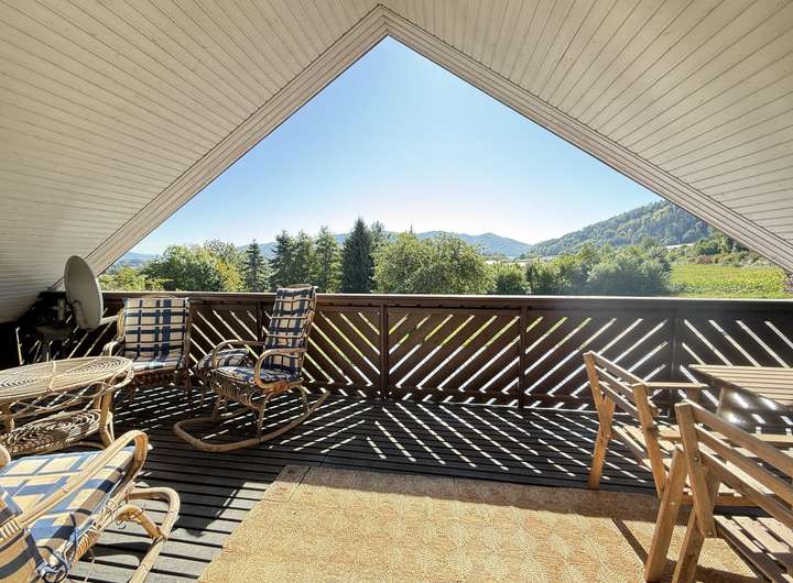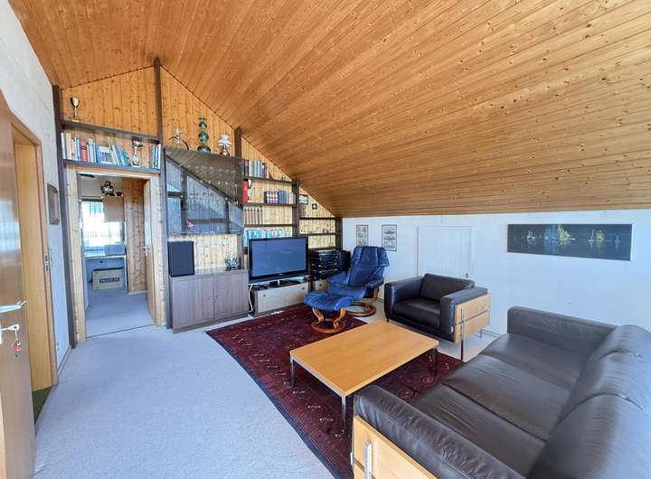 Das Dachgeschoss ist als separates Studio mit rund 45 m² Wohnfläche ausgebaut. Neben einem großen, hellen Wohnbereich stehen ein Schlafzimmer, eine Küche sowie ein Duschbad zur Verfügung. Besonders eindrucksvoll ist der großzügige Balkon, von dem aus Sie einen traumhaften Ausblick über die Natur genießen.