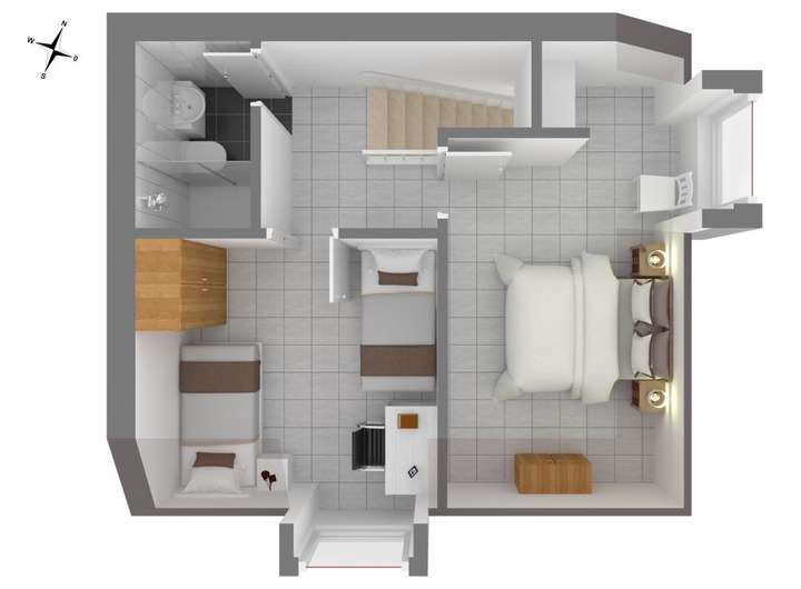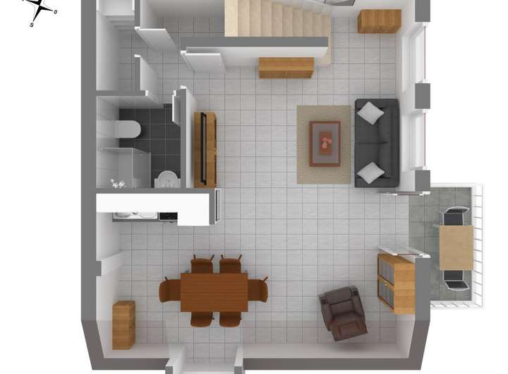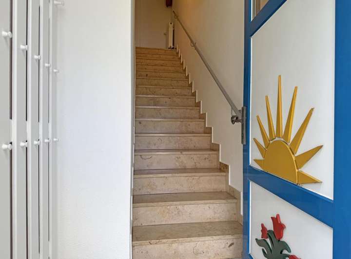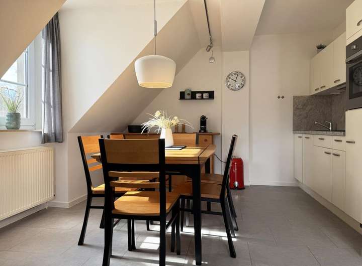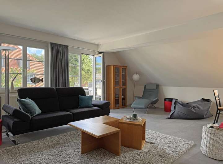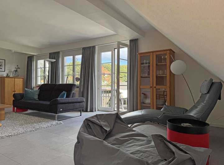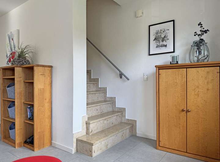 Die angebotene Wohnung erstreckt sich über drei Ebenen und ist über eine eigene Eingangstür zugänglich. Im Erdgeschoss empfängt ein Flur mit Garderobe, von hier führt eine massive Treppe ins Obergeschoss. Dort öffnet sich ein großzügiger Wohn- und Essbereich mit Küche und Zugang zum Balkon. Ein Abstellraum sowie ein Duschbad ergänzen diese Ebene. Im Dachgeschoss befinden sich zwei Schlafzimmer, ein kleiner Flur sowie ein weiteres, raumhoch gefliestes Duschbad. Verdunklungsplissees, Verdunklungsgardinen, Insektenschutz und pflegeleichte Vinylböden sorgen für Alltagstauglichkeit.