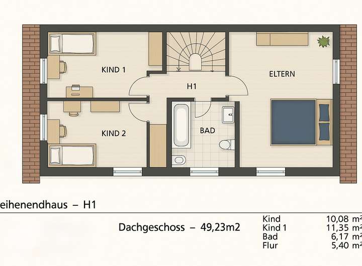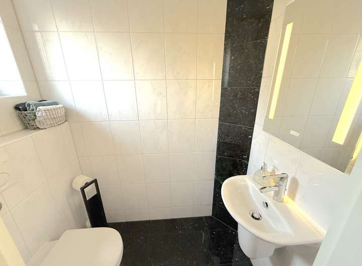 Im Obergeschoss erwarten Sie zwei helle Schlafzimmer sowie ein hochwertig ausgestattetes Bad mit bodengleicher Dusche, Fußbodenheizung und großzügiger Badewanne – ideal zum Entspannen.