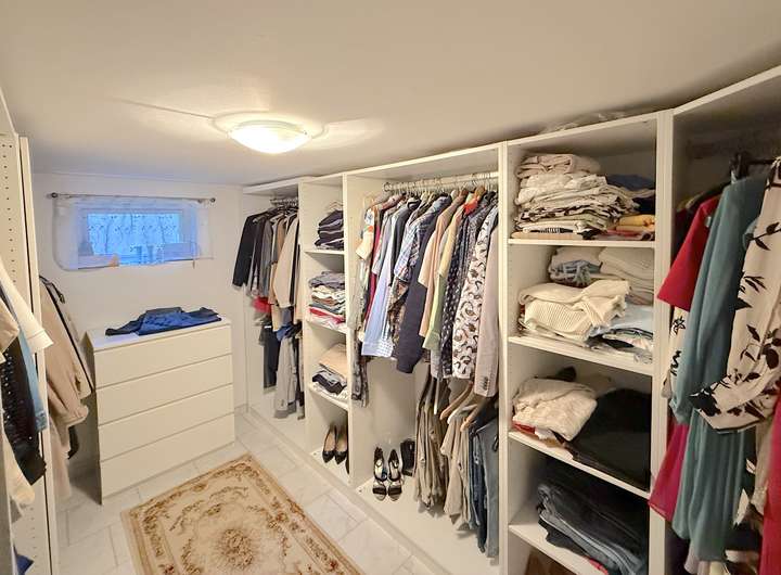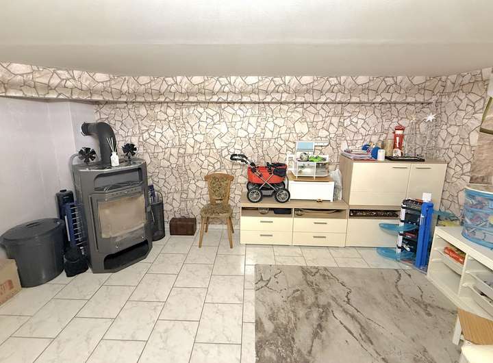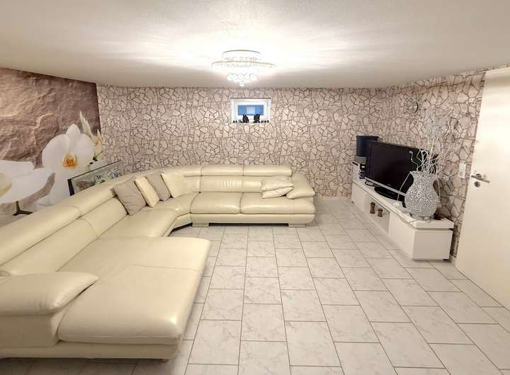 Der voll ausgebaute Keller überzeugt mit einem wohnlich gestalteten Kaminzimmer, einer Ankleide sowie eine praktische Waschküche.