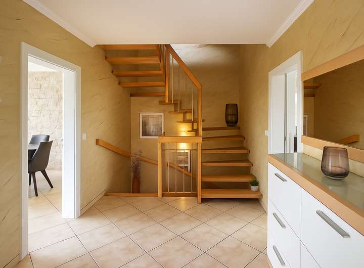- Hochwertige Steinfliesenwand im Treppenhaus