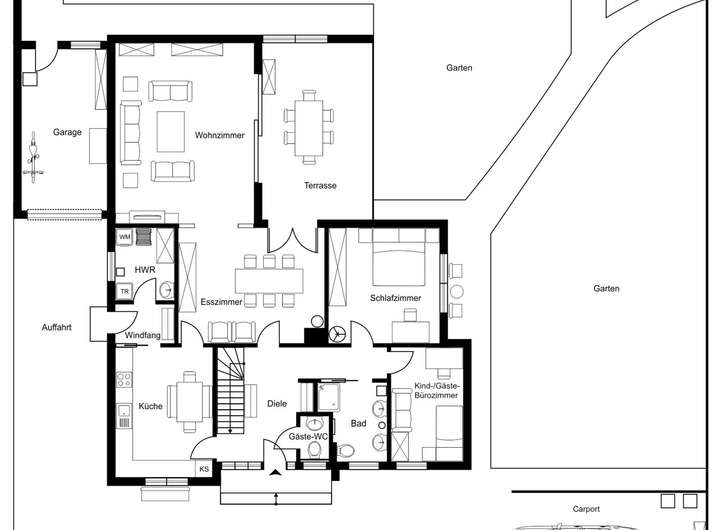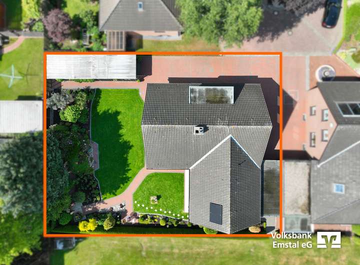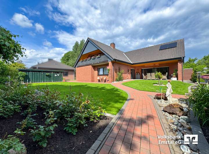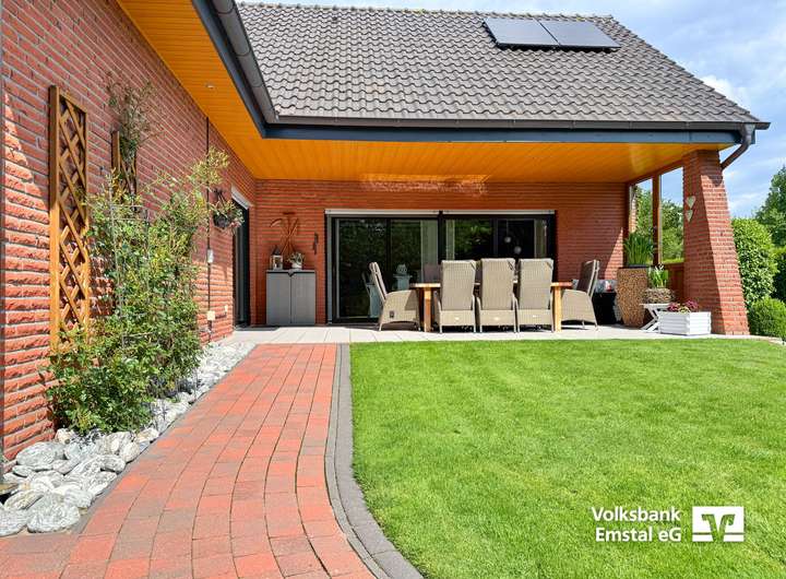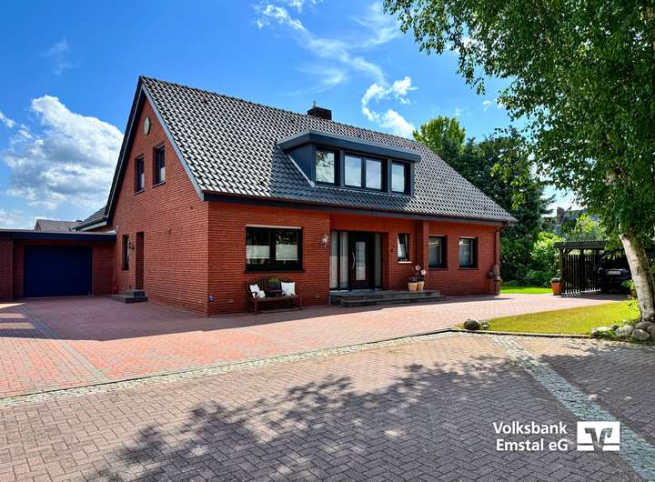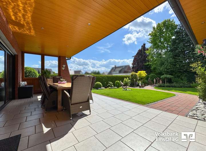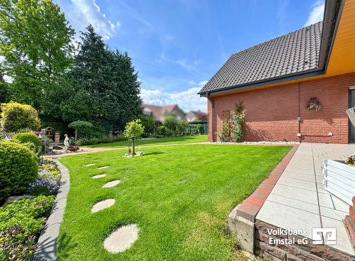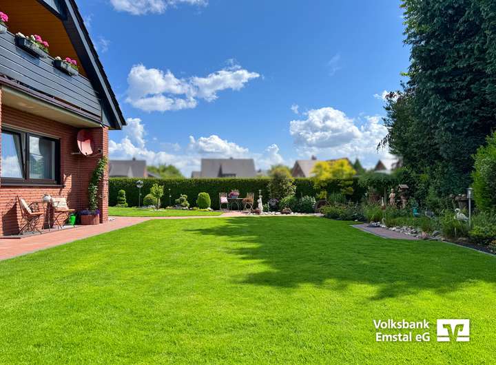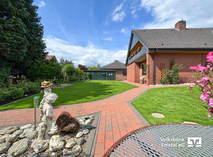 Der liebevoll angelegte Garten mit Süd-Ost-Ausrichtung mit mehreren Sitzgelegenheiten und einer einladenden Terrasse lädt zum Entspannen und Verweilen ein. Eine Garage sowie ein frei stehender Carport bieten komfortable Parkmöglichkeiten.