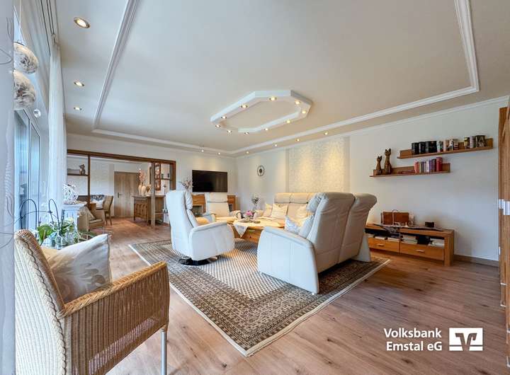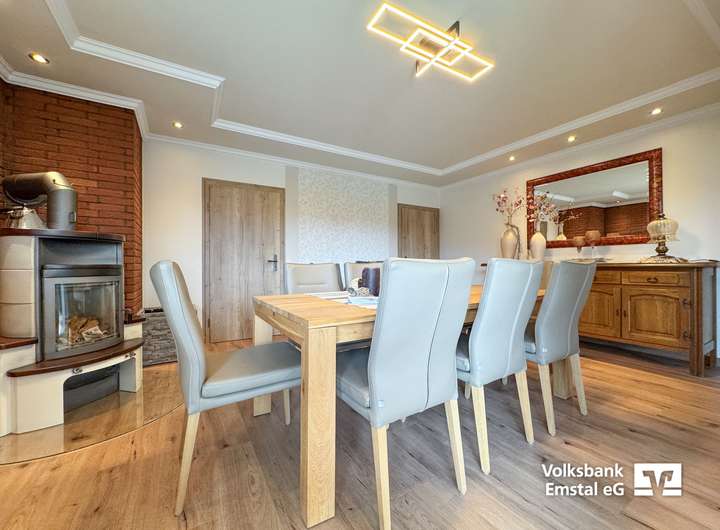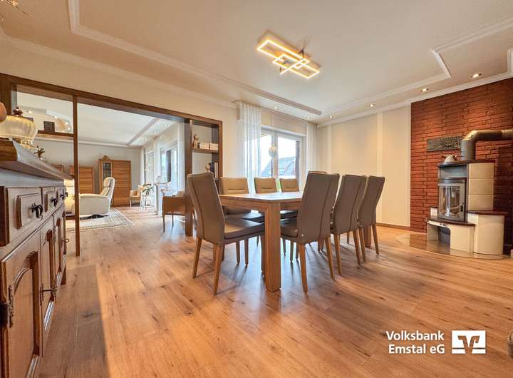 – großzügiges Wohn- und Esszimmer mit Holzkamin und Zugang zur Terrasse