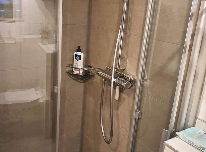 Das Badezimmer wurde vor kurzem modernisiert, es ist hell gefließt mit erneuerten Wasserleitungen, einer Walk-In-Dusche und zeitgemäßer Elektrik.