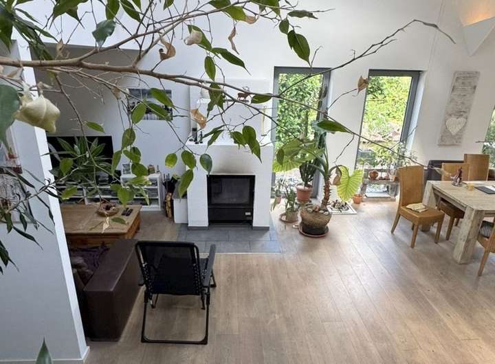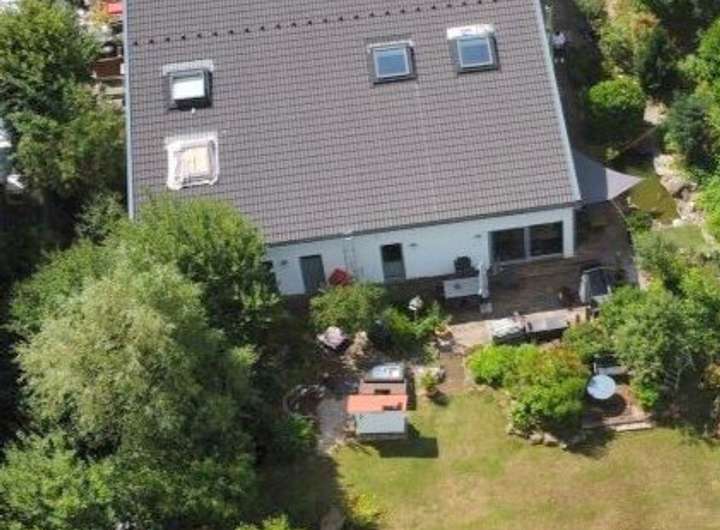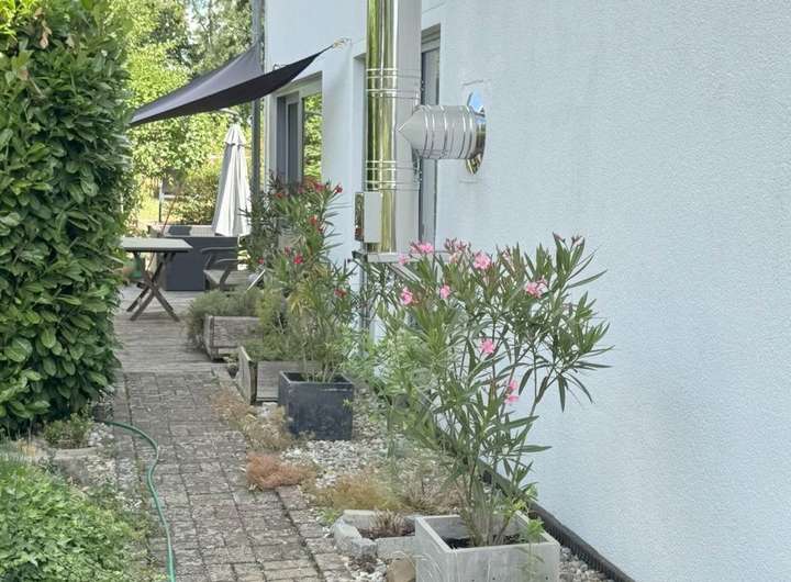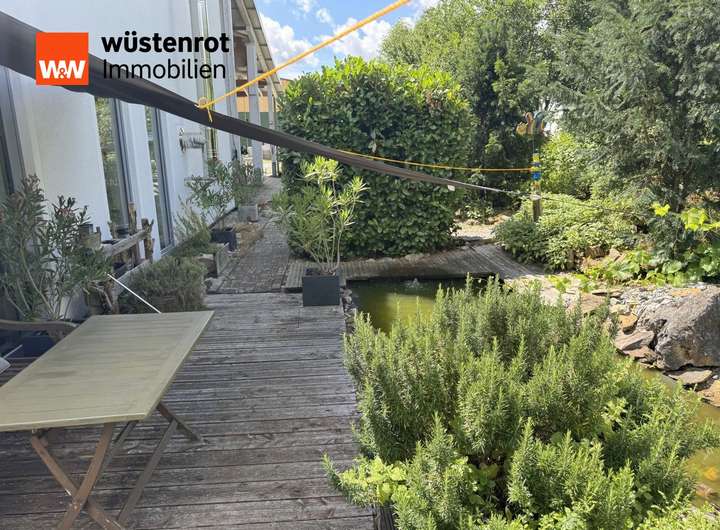 Dieses stilvolle Einfamilienhaus mit eigener Zufahrt liegt wunderschön eingebettet in einer malerischen Umgebung mit Blick auf ein idyllisches Waldstück im Wohn- und Gewerbegebiet Dettenried. Das Einfamilienhaus mit Pultdach beeindruckt durch seine moderne Ausstattung und durchdachte Architektur. Hohe Decken und bodentiefe Fenster im Erdgeschoss sorgen für ein offenes und lichtdurchflutetes Ambiente. Die Galerie im Obergeschoss mit den Schlafräumen und die elegante Edelstahltreppe verleihen dem Wohnraum zusätzlichen Charme. Herzstück des Hauses ist die offene Wohnküche mit Einbauküche und einladendem Kamin, perfekt für gesellige Abende mit Familie und Freunden. Der weitläufige Garten, ausgestattet mit einem Fischteich und Grillplatz, bietet reichlich Platz für Kinder zum Spielen sowie die Möglichkeit, einen Pool zu integrieren. Derzeit ist ein Teilbereich des Erdgeschosses abgetrennt und wurde als Appartement mit eigenem Eingang von der Ostseite des Hauses genutzt. Siehe Grundriss heute. In der ursprünglichen Planung war diese Abtrennung nicht vorgesehen, und lässt sich durch Abbau der Trockenbauwände in den alten Zustand zurückbauen. Siehe Grundriss 1 Ursprungsplan. Auf dem Grundriss 3 in Fotogalerie erkennen Sie das gesamte Grundstück von 2259 m² mit Ihrer eigenen Zufahrt.