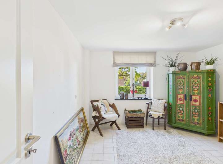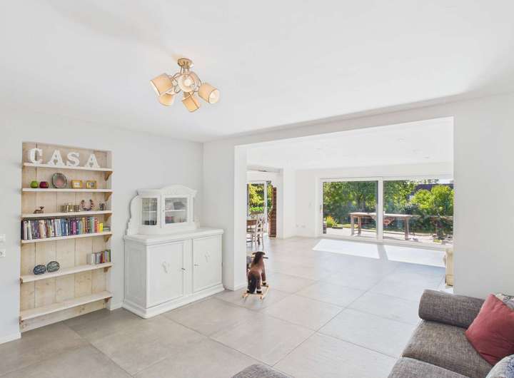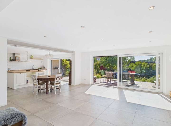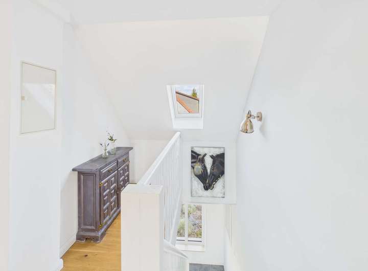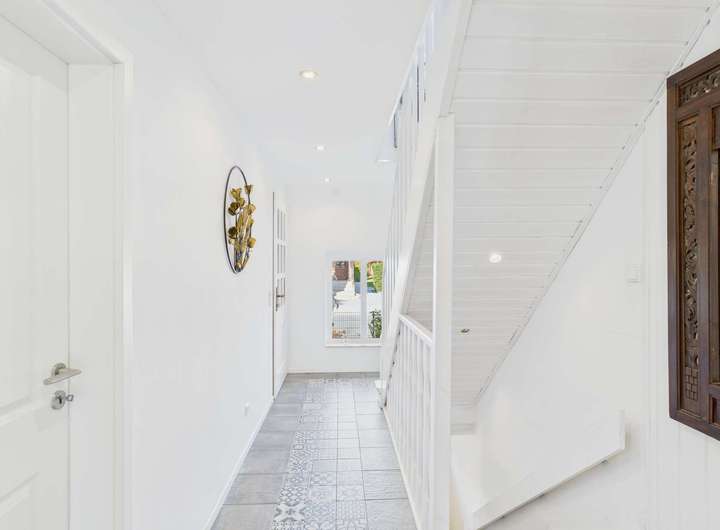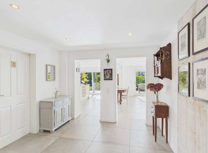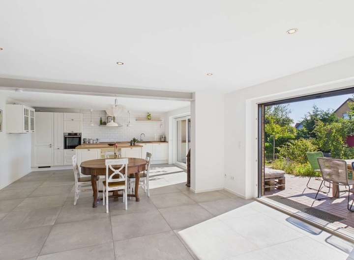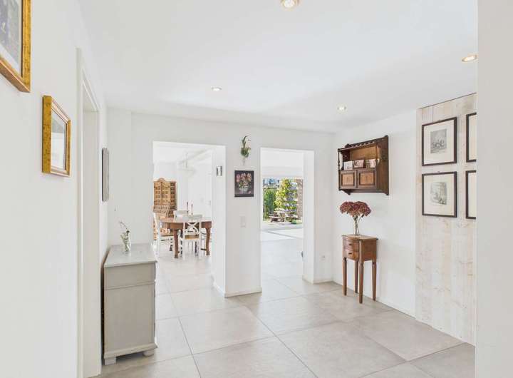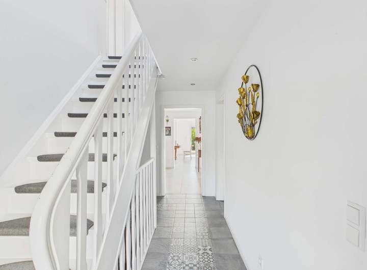 Wir befinden uns in einem wunderschönen Hausflur mit besonderen Fliesenelementen und einer weißen Holztreppe. Blickt man nach rechts, so geht der Blick zum Flur und zum Wohn-Esszimmer. Doch bevor Sie diesen Bereich betreten, befindet sich auf der rechten Seite ein Zimmer mit Wasseranschluss, das für viele ganz unterschiedliche Funktionen geeignet ist. Betreten Sie nun mit uns den Flur. Auf der linken Seite befinden sich das Gästezimmer, ein kleines Aufbewahrungszimmer und das schöne Duschbad. Geradezu geht es in das Wohn-Esszimmer mit offener Küche und gemütlicher Wohnecke im hinteren Bereich. Highlight dieses großen Wohnbereichs ist die große Fensterfront mit Blick zum Garten. Auf der Terrasse davor kann man im Herbst die Trauben ernten, die vom darüberliegenden Balkon hängen und köstlich schmecken. Von weitem grüßt die Flechtorfer Mühle, das Wahrzeichen des Ortes.