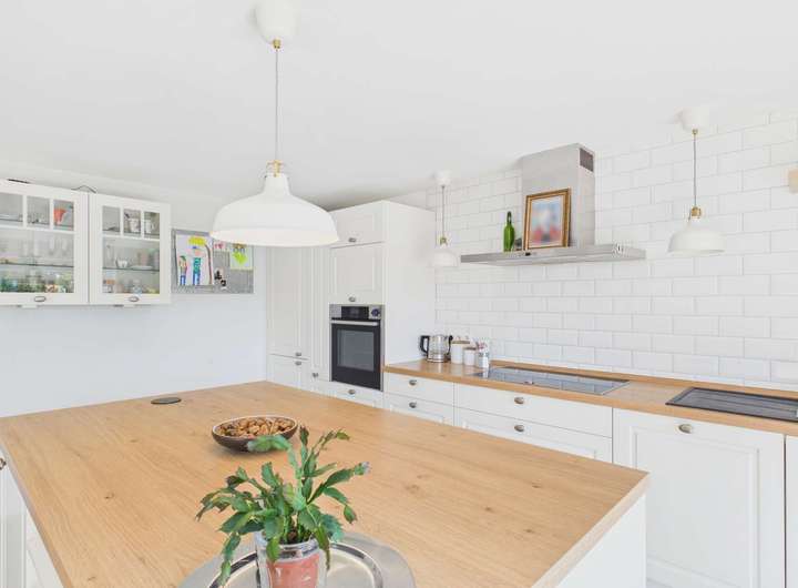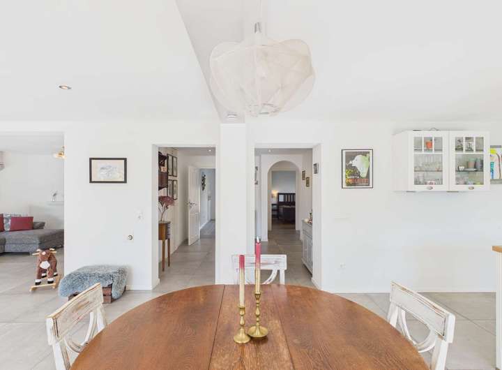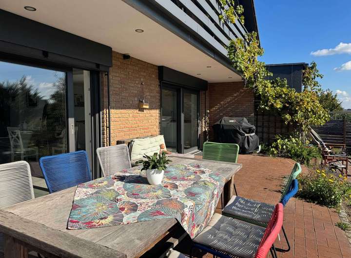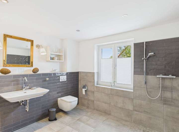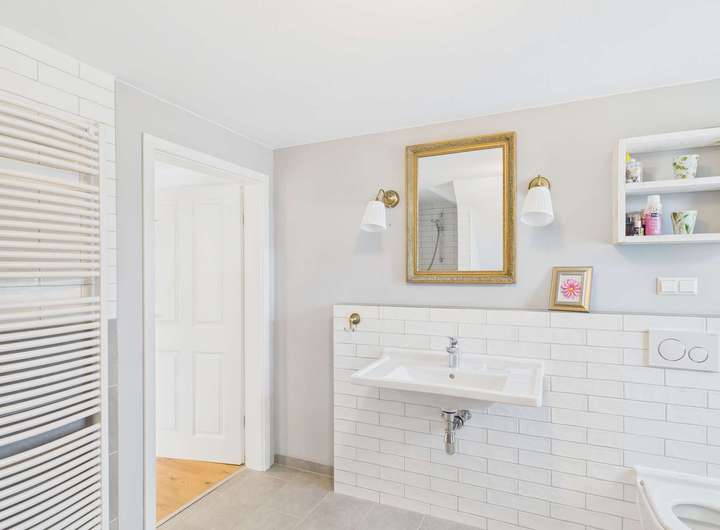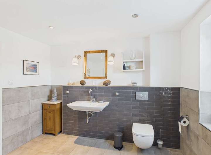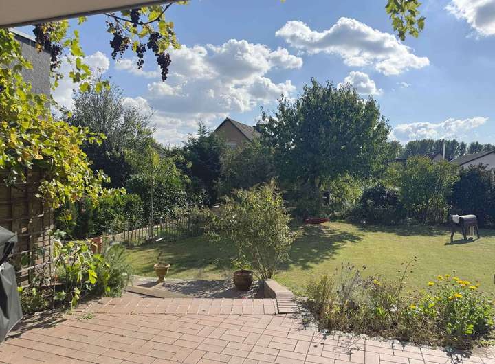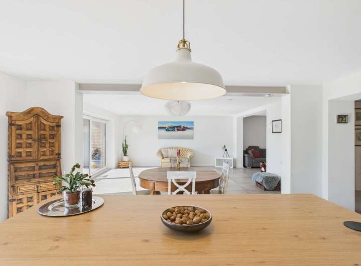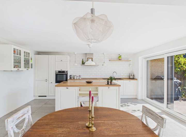 Wir befinden uns in einem wunderschönen Hausflur mit besonderen Fliesenelementen und einer weißen Holztreppe. Blickt man nach rechts, so geht der Blick zum Flur und zum Wohn-Esszimmer. Doch bevor Sie diesen Bereich betreten, befindet sich auf der rechten Seite ein Zimmer mit Wasseranschluss, das für viele ganz unterschiedliche Funktionen geeignet ist. Betreten Sie nun mit uns den Flur. Auf der linken Seite befinden sich das Gästezimmer, ein kleines Aufbewahrungszimmer und das schöne Duschbad. Geradezu geht es in das Wohn-Esszimmer mit offener Küche und gemütlicher Wohnecke im hinteren Bereich. Highlight dieses großen Wohnbereichs ist die große Fensterfront mit Blick zum Garten. Auf der Terrasse davor kann man im Herbst die Trauben ernten, die vom darüberliegenden Balkon hängen und köstlich schmecken. Von weitem grüßt die Flechtorfer Mühle, das Wahrzeichen des Ortes.