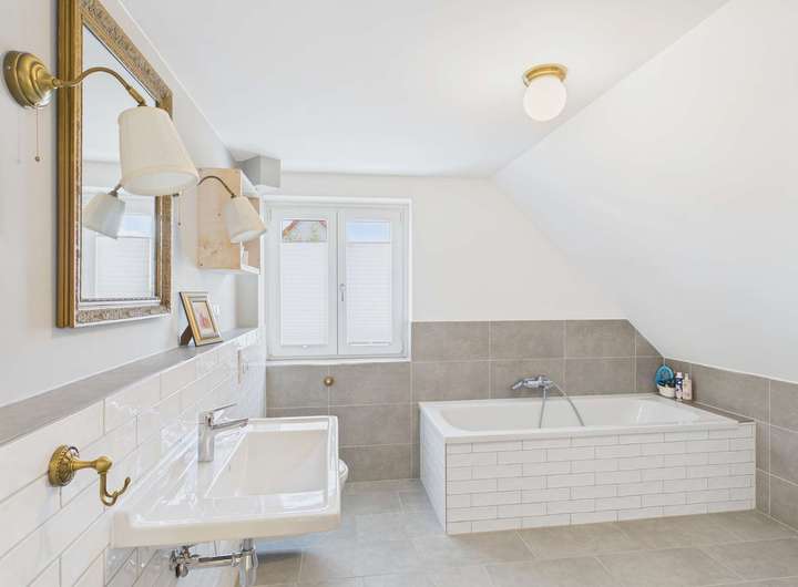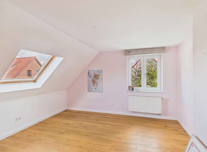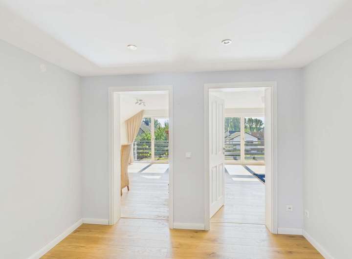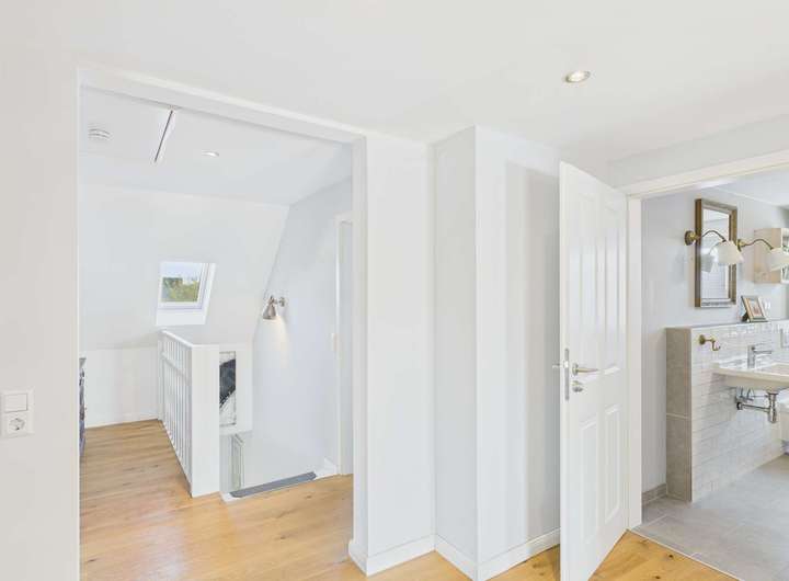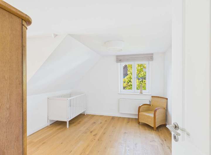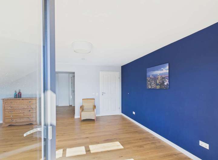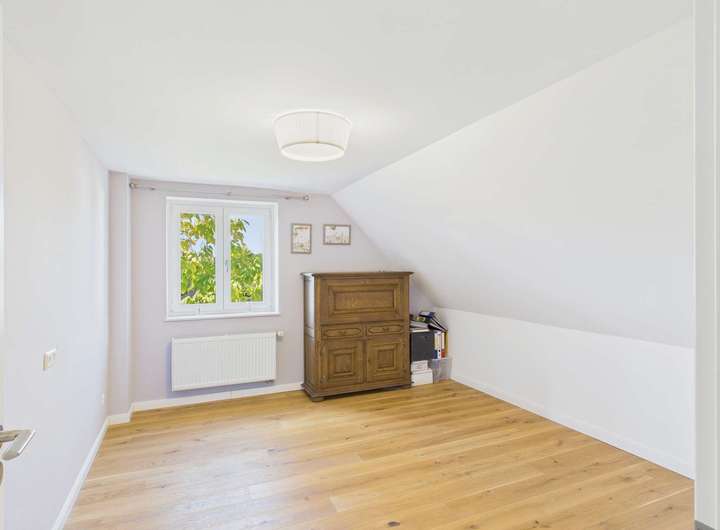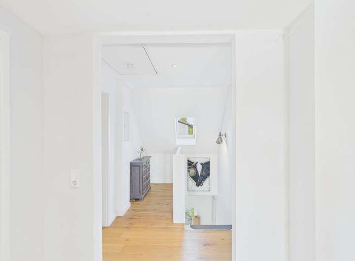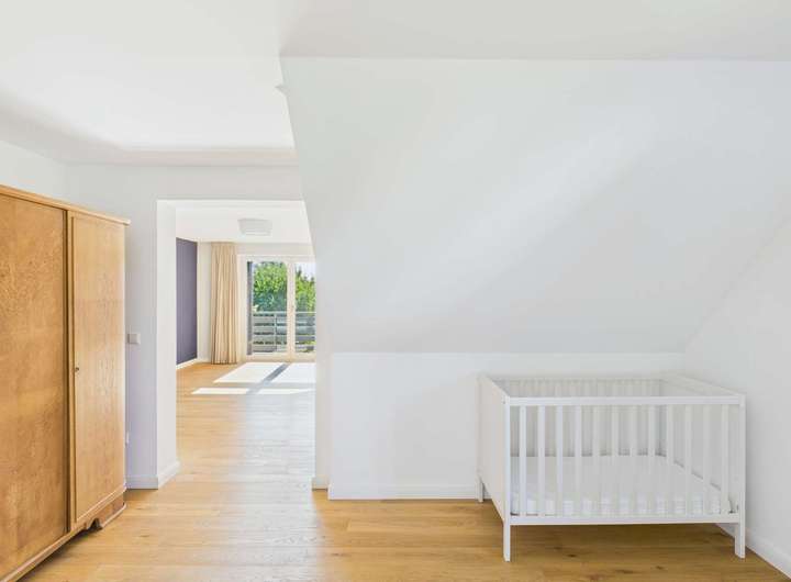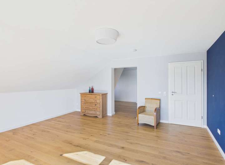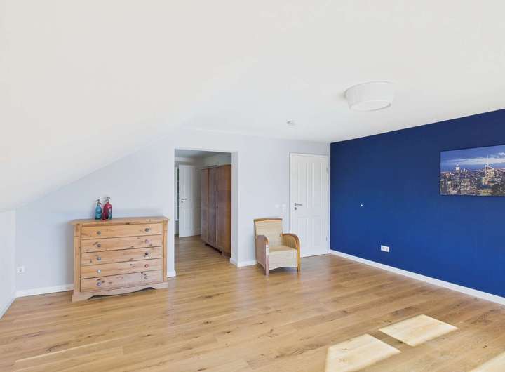 Im Obergeschoss befinden sich diverse großzügig gestaltete Schlafräume und das Familienbad. Das große Schlafzimmer und das links daneben befindliche Zimmer haben einen direkten Zugang zum überdachten Balkon. Insgesamt haben Sie im Obergeschoss 4 Schlafräume und ein Ankleidezimmer, das auch als Babyzimmer genutzt werden könnte.