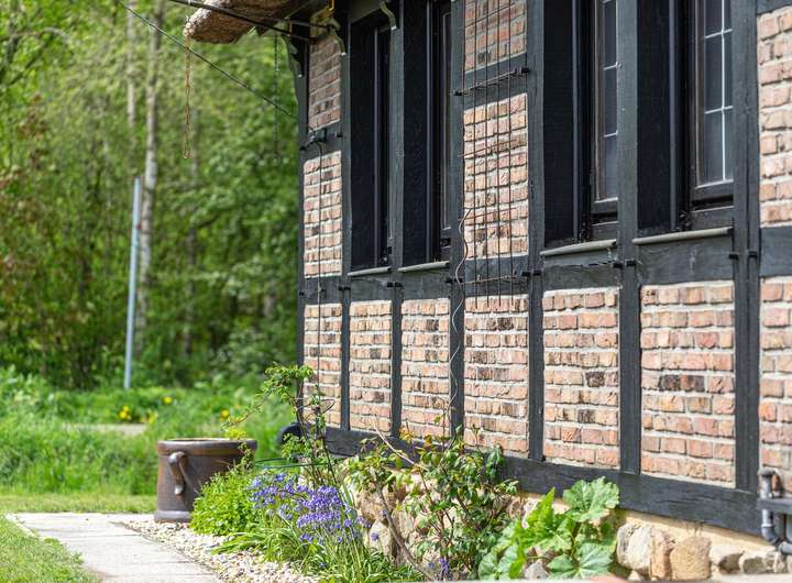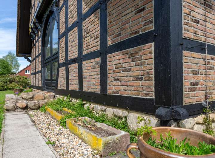 • Außenmauerwerk zweischalig: Außenschale aus altem Eichenholzfachwerk mit Klinkersteinen aus Ammerländer Bauernhäusern, Hohlschicht, innere Schale aus weiß gestrichenem Kalksandstein