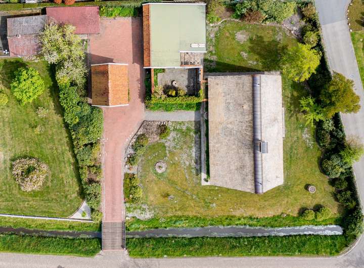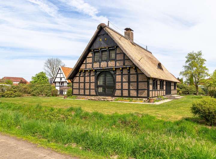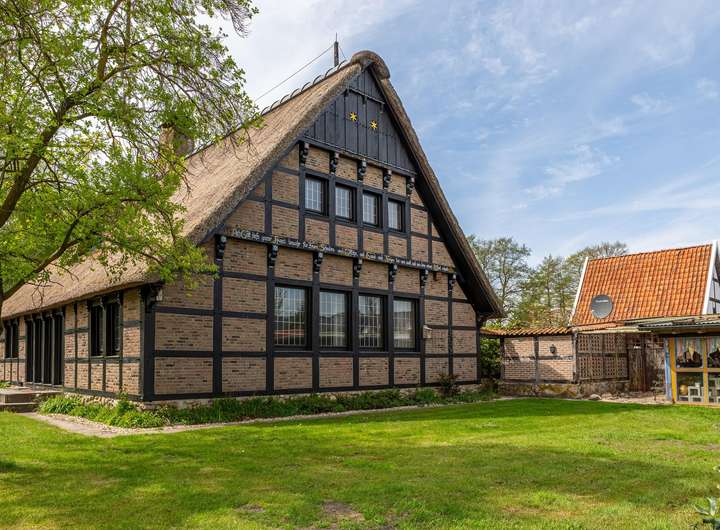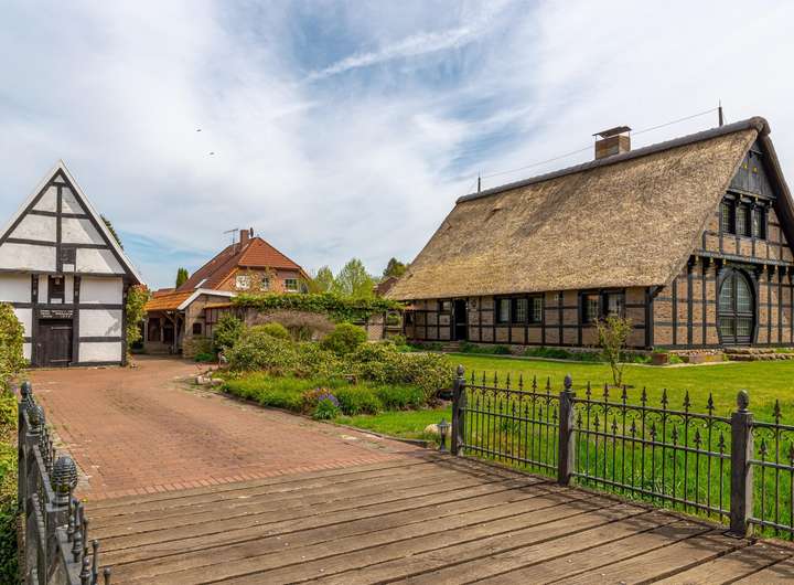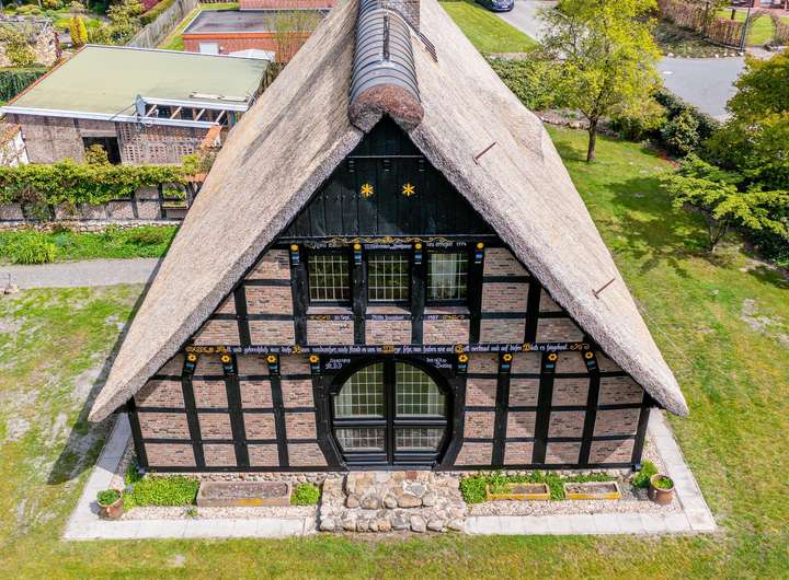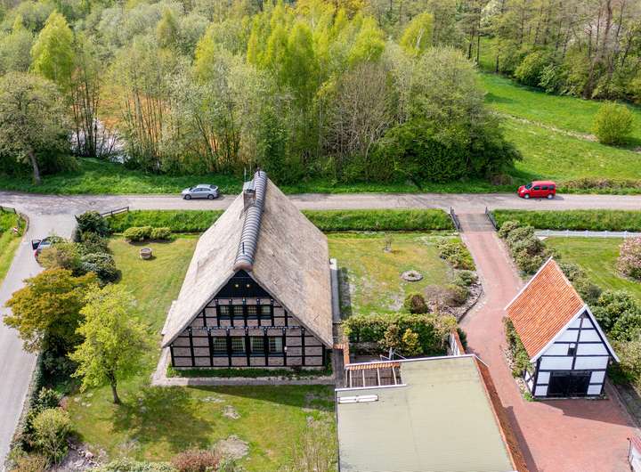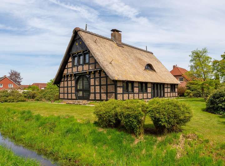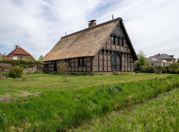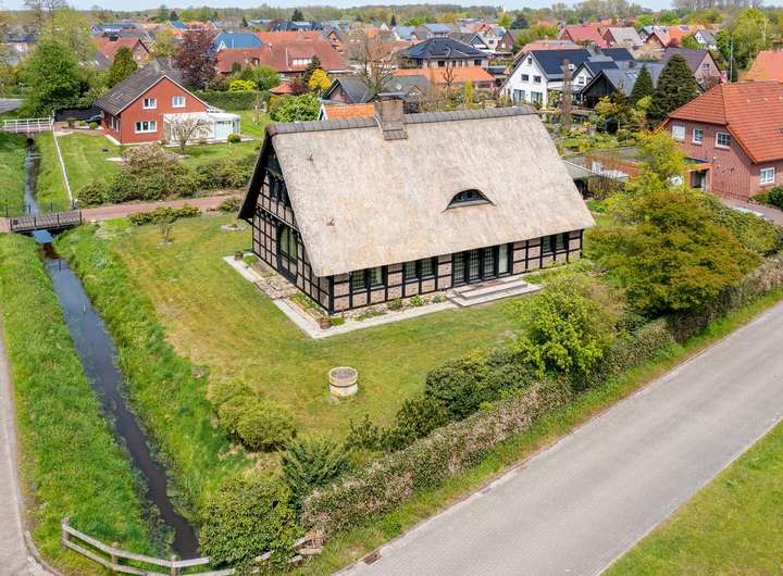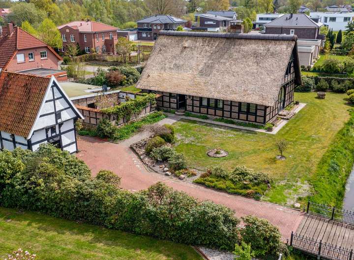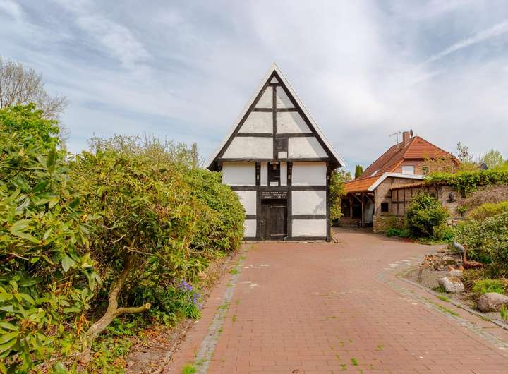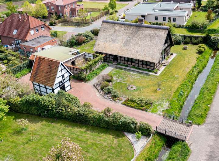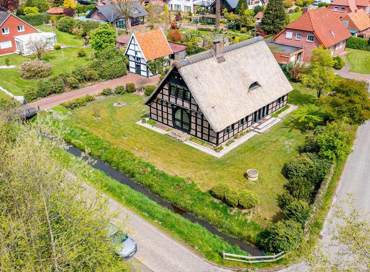 Das reetgedeckte Fachwerkhaus liegt auf einem liebevoll gestalteten, ca. 1.650 m² Grundstück, in direkter Lage am Stadtpark u. Fischteichen von Friesoythe. Über eine massive Holzbrücke gelangt man auf das Grundstück, wo sich Wohnhaus, Spiker, Carport u. Pergola befinden.