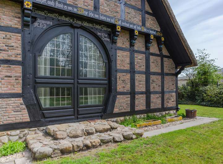• Giebelseite mit originaler Grootdör (historische Dielentür) mit Sprossen- und Bleiverglasung