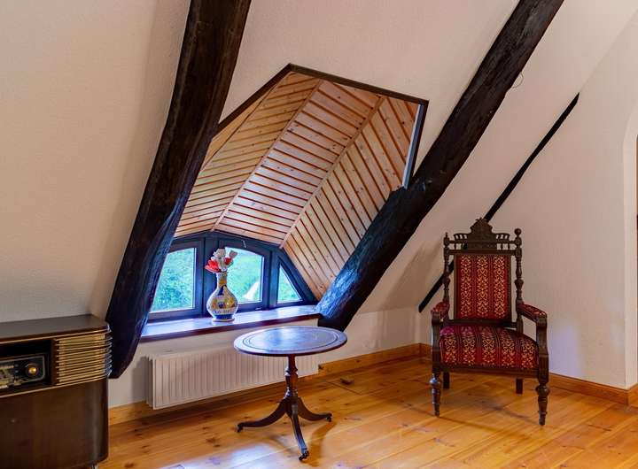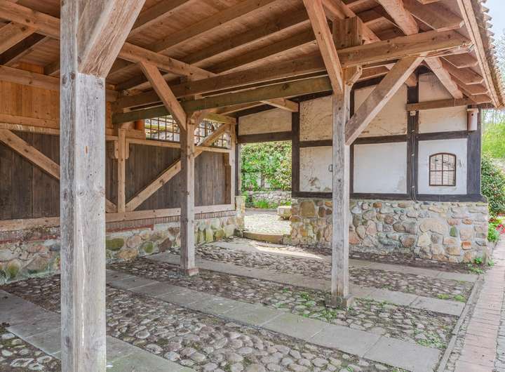 • Eichenständer- und Trägerwerk im Erdgeschoss (2022 nachbehandelt und gestrichen)