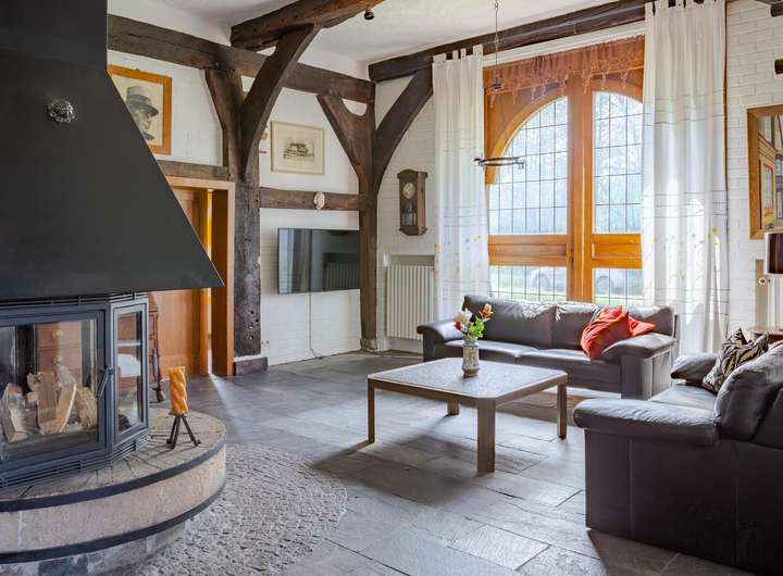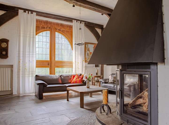 • Gemauerter Kamin auf Mühlsteinsockel als zentrales Gestaltungselement