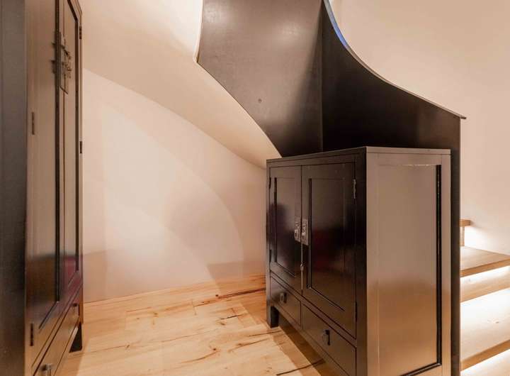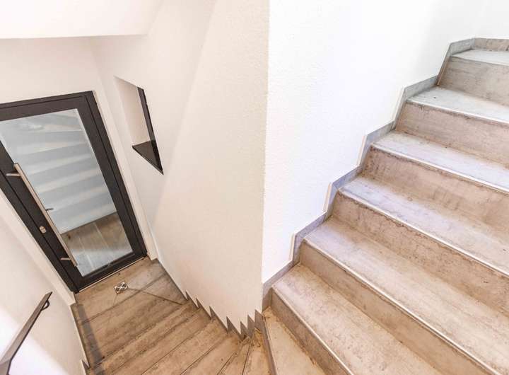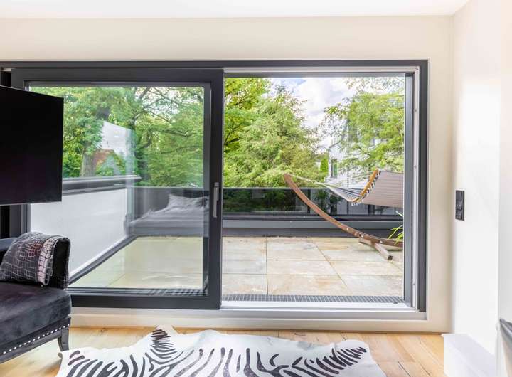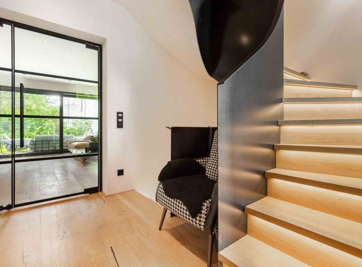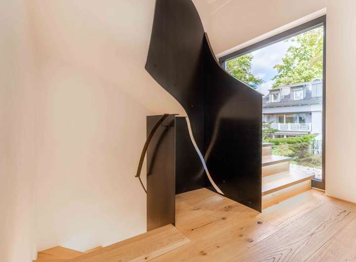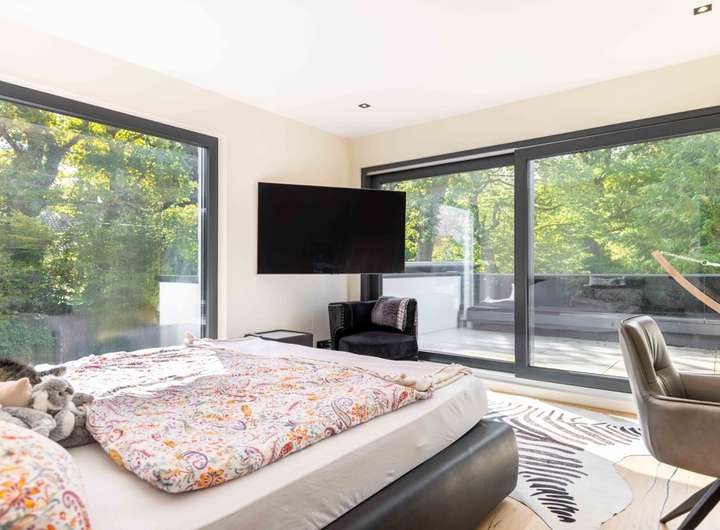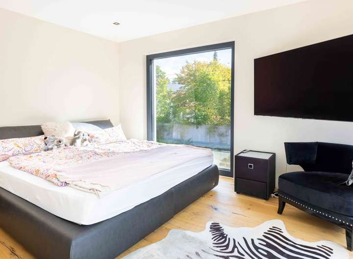 Über die beleuchtete Treppe mit markantem Stahlgeländer gelangt man in das Obergeschoss. Hier befinden sich zwei Schlafzimmer, beide mit direktem Zugang zum sonnigen Balkon mit Südausrichtung, ein perfekter Rückzugsort, um den Blick in den Garten zu genießen und den Tag in Ruhe ausklingen zu lassen. Ergänzt wird diese Ebene durch eine maßgefertigte Ankleide sowie ein luxuriös ausgestattetes Tageslichtbad, von dem aus man direkten Zugang zur Dachterrasse mit Nordost Ausrichtung hat.