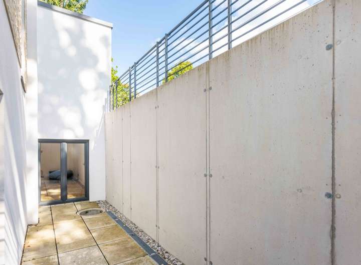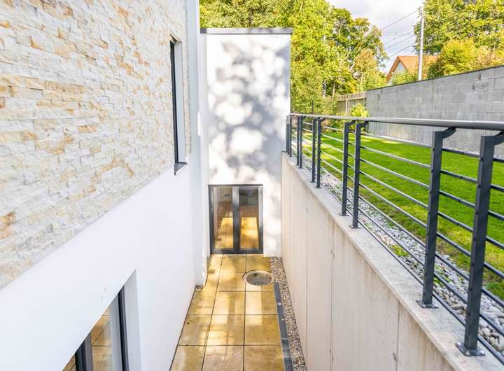 Das Untergeschoss bietet neben dem Hauswirtschaftsraum eine separate Einliegerwohnung mit eigenem Zugang. Diese umfasst einen großzügigen Wohn und Arbeitsbereich mit Lichtgarten, einen Hobbyraum, eine moderne Einbauküche sowie ein stilvolles Badezimmer. Der Technikraum befindet sich im angrenzenden Bereich.