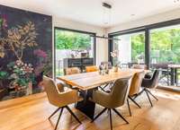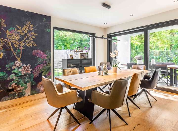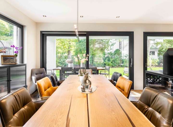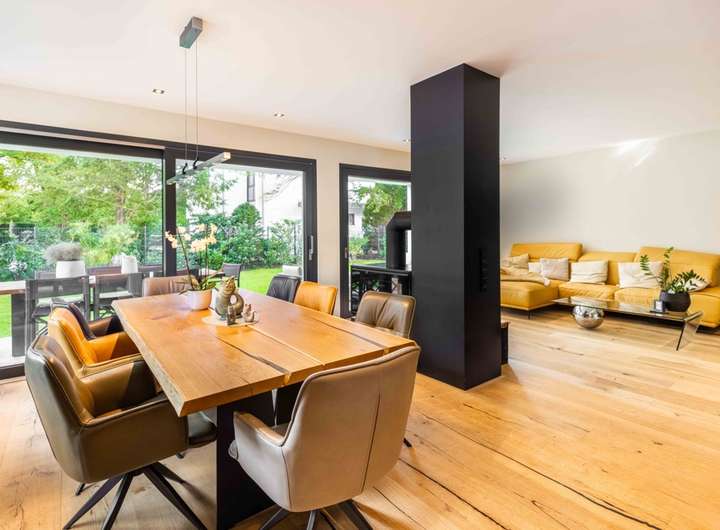 Der einladende Eingangsbereich mit maßgefertigtem Garderobenschrank und elegantem Gäste WC führt durch eine verglaste Lofttür in den offen gestalteten Wohn, Ess und Kochbereich. Großzügige Fensterflächen eröffnen den Blick auf die überdachte Terrasse und den liebevoll angelegten Garten mit idealer Südausrichtung. Im Wohnbereich sorgt ein edler Holzkamin für behagliche Wärme, während die hochwertige Einbauküche mit modernen Geräten harmonisch in das offene Konzept integriert ist.
