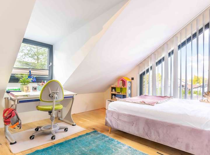 Im Dachgeschoss liegen zwei weitere Zimmer, die flexibel als Kinder, Gäste oder Arbeitszimmer genutzt werden können. Ergänzt wird diese Ebene durch ein weiteres Badezimmer mit Tageslicht, das Komfort und Funktionalität ideal vereint.