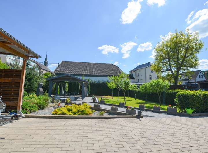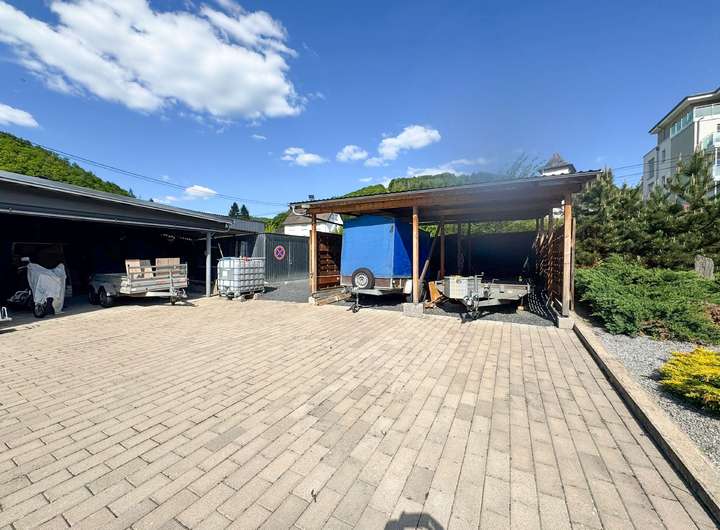Im hinteren Bereich des Grundstücks erwarten Sie ein überdachter Freisitz, zwei Carports sowie zwei Garagen. Weitere Außenstellplätze sind ebenfalls vorhanden.