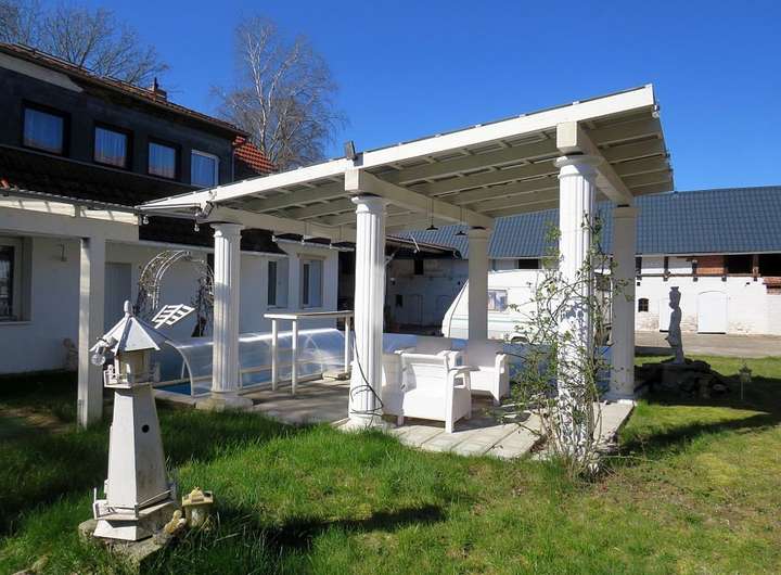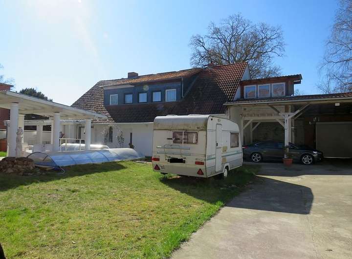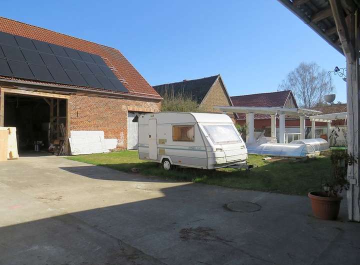 Die vorhandenen Nebengebäude bieten auf einer Nutzfläche von ca. 540 m² Platz für Hobby- und Freizeitaktivitäten sowie Unterstellmöglichkeiten für Wohnwagen, Wohnmobil oder größere Fahrzeuge. Zusätzlich ist eine Freifläche für KFZ-Außenstellplätze vorhanden. Die Trecker-Scheune bietet KFZ-Stellplätze und eine Werkstatt. Vom Unterstand gibt es eine Durchfahrt zur Straße.
