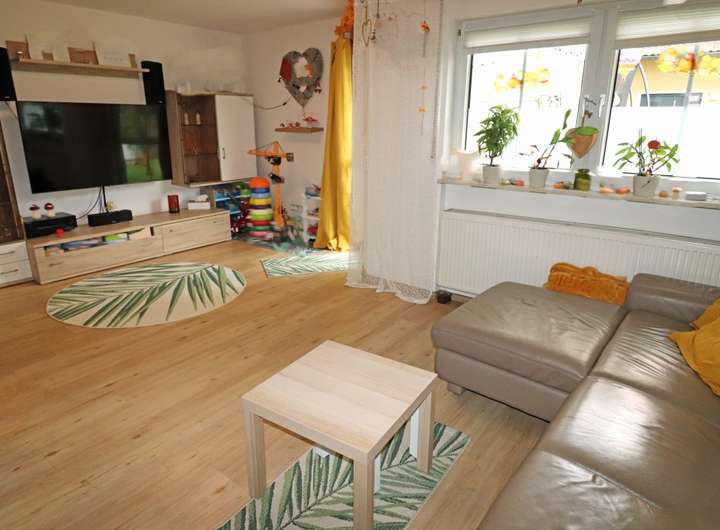 Der angrenzende Wohnbereich ist lichtdurchflutet und bietet Zugang zur überdachten Pergola und zum gepflegten Garten – ideal für gemütliche Stunden im Freien.