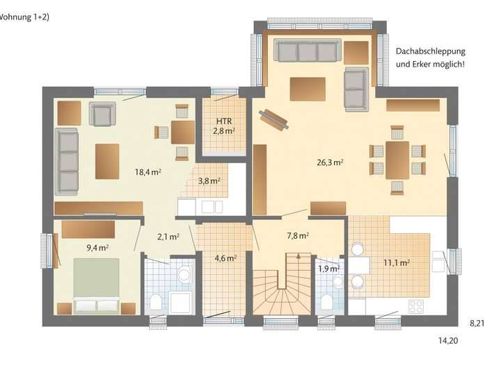 Anbauteile, Carport, Garage und Keller können Extras sein, die als Sonderausstattung angeboten werden. Abbildungen, Grundrisse und Flächenangaben sind beispielhaft und können Extras zeigen. Flächenangaben nach DIN 277.