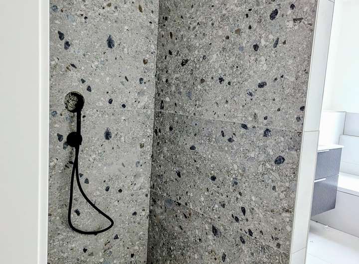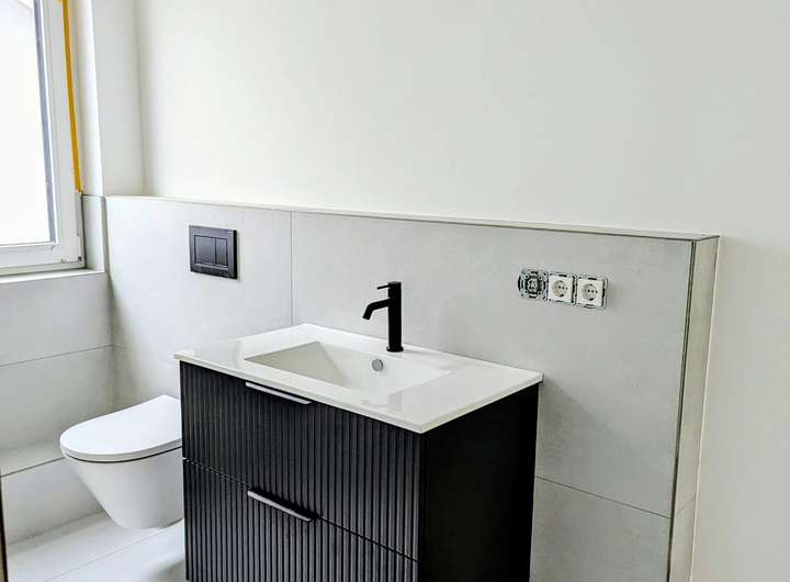 - Luxuriöse Badezimmer im Stil der Zeit, z.B. schwarze Armaturen