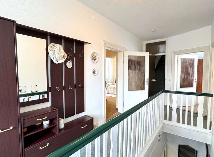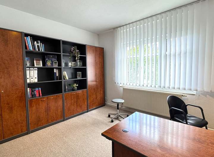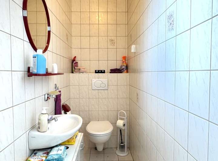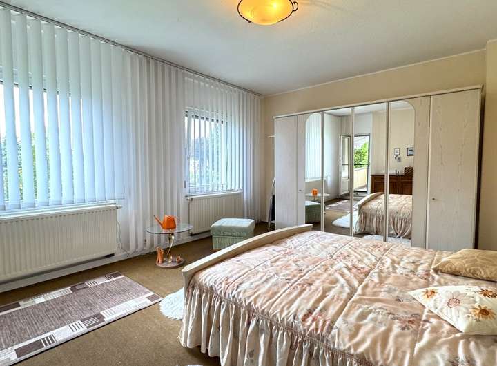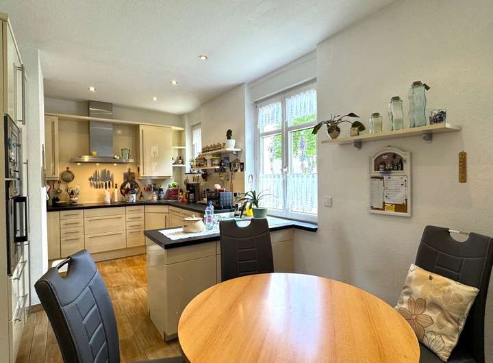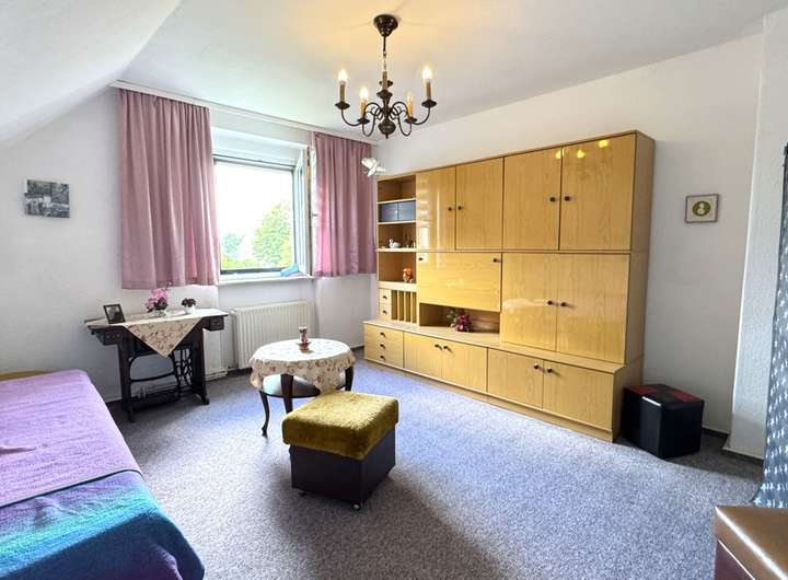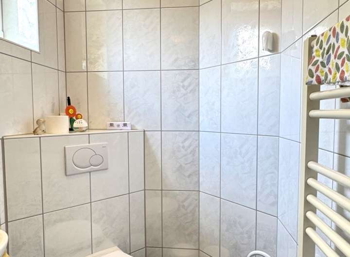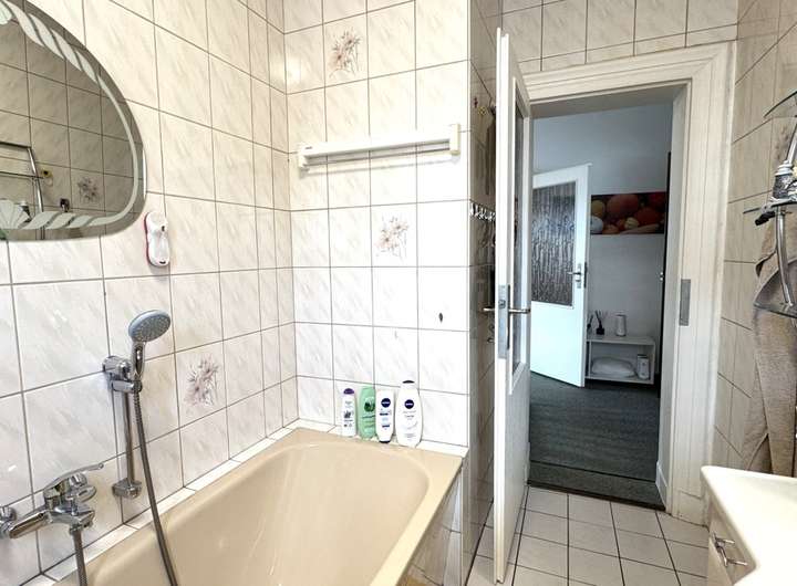 Im Obergeschoss geht es genauso großzügig weiter: Ein geräumiges Schlafzimmer mit Balkon, ein Arbeitszimmer, eine Ankleide, ein zweites Gäste-WC sowie eine weitere Küche bieten maximale Flexibilität. Das Tageslichtbad mit Wanne und Dusche ist gepflegt, sollte aber optisch modernisiert werden – eine perfekte Gelegenheit für Individualisten.