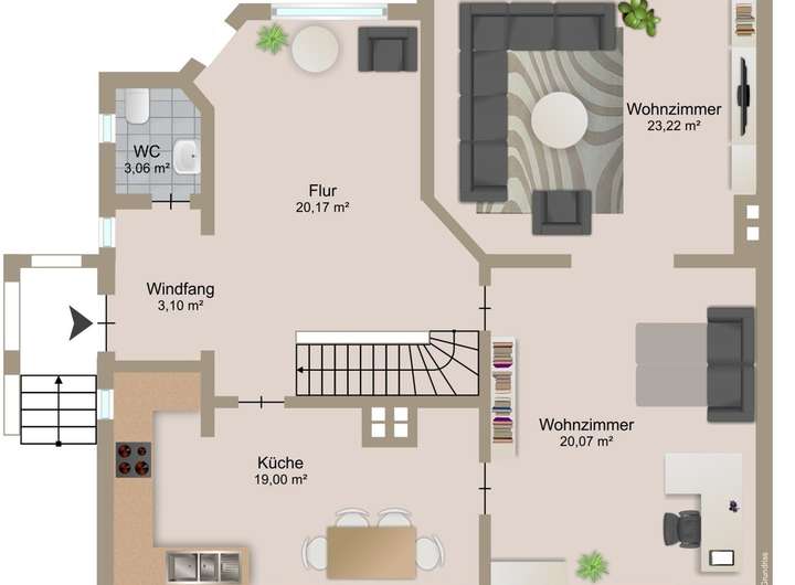 - drei Hauseingänge (Windfang, Panoramaecke, Keller)