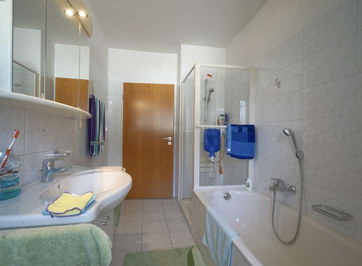 Bad: Wannen- und Duschbad, hell gefliest mit Fenster