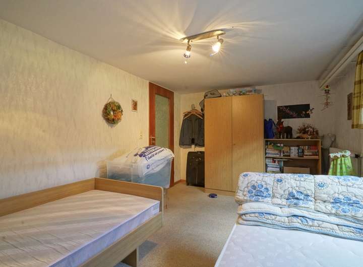 Das Haus verfügt über einen weitläufigen Wohn- und Essbereich, drei weitere Zimmer, eine praktische Einbauküche sowie ein hell gefliestes Badezimmer mit Wanne und Dusche. Ein separates Gäste-WC rundet das Raumangebot im Erdgeschoss ab.