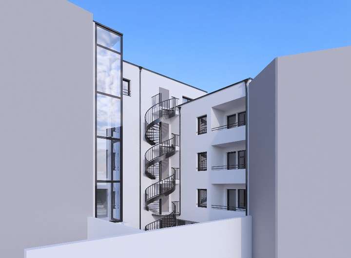 In der Tiefgarage im Kellergeschoss sind Stellplätze für 7 Fahrzeuge sowie 46 Fahrradstellplätze vorgesehen. Das Haus hat ein Treppenhaus und einen Aufzug.