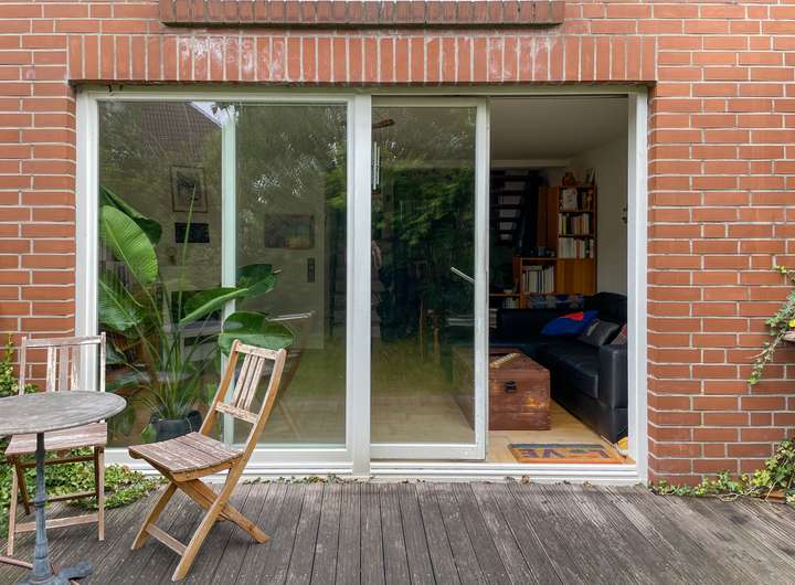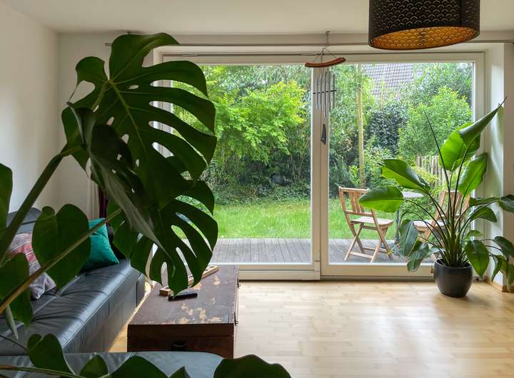 Wohn- und Essbereich auf zwei Ebenen mit Zugang zur Süd-Terrasse und eigenem Garten