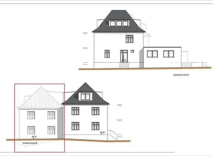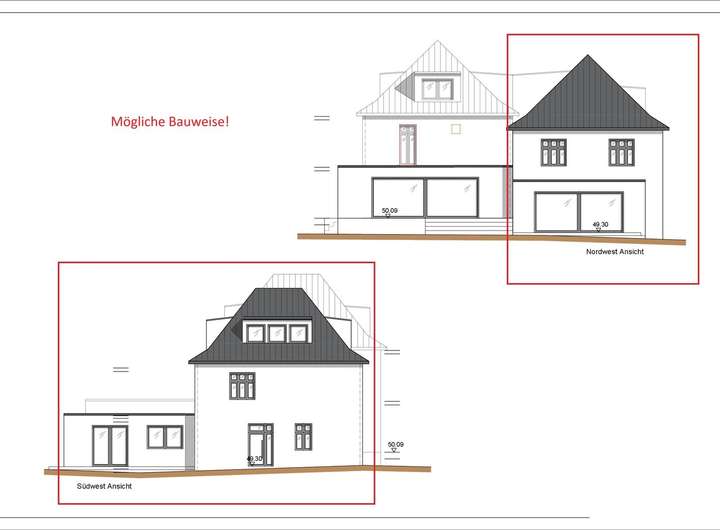 Errichtet werden kann hier ein Einfamilienhaus. Das Einfamilienhaus ist nicht freistehend, sondern müsste direkt an das bereits bestehende Haus angebaut werden. Hier kann ein Einfamilienhaus mit einer Wohnfläche zwischen 120m² und 200m² errichtet werden.