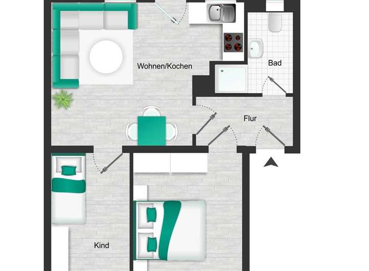 Der gut durchdachte Grundriss schafft ein angenehmes Wohngefühl: Das Herzstück der Wohnung bildet der helle Wohnbereich mit offener Küche, der nahtlos in den Balkon übergeht – perfekt für entspannte Stunden im Freien. Das Schlafzimmer ist großzügig geschnitten und ruhig gelegen. Ein weiteres Zimmer eignet sich ideal als Kinder-, Arbeits- oder Gästezimmer. Das Tageslichtbad ist funktional ausgestattet und mit einer Dusche versehen, der zentrale Flur verbindet alle Räume auf kurze Wege.