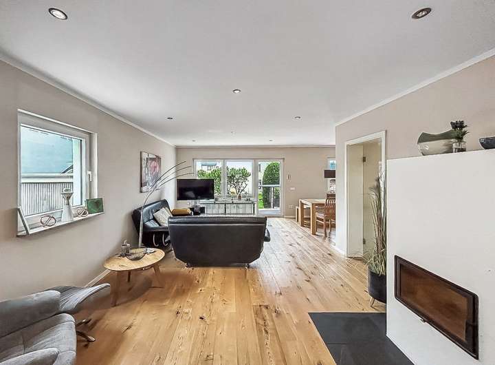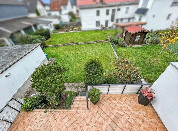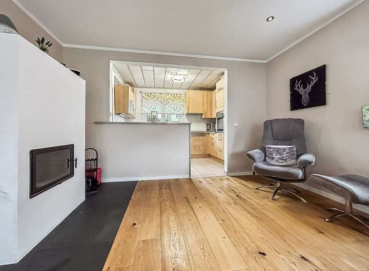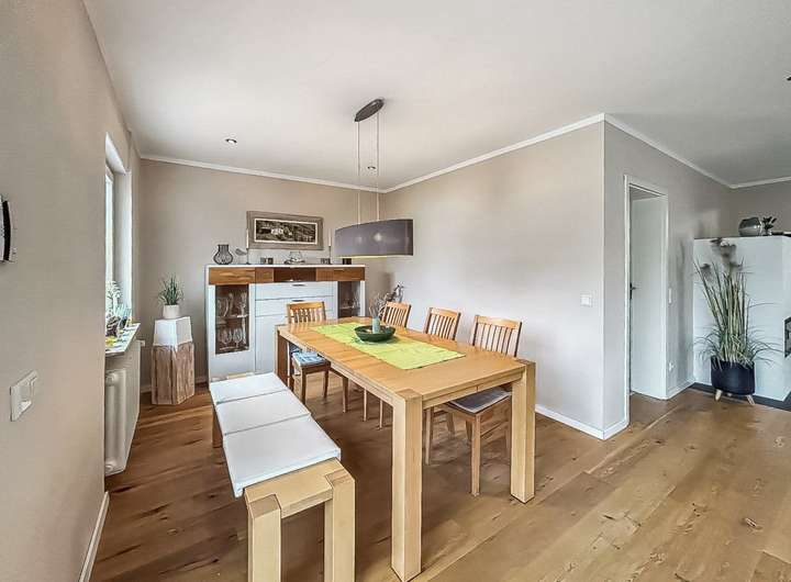 Im Erdgeschoss erwartet Sie ein offener und heller Wohn- und Essbereich mit angrenzender Küche, der durch einen gemütlichen Kaminofen eine besonders behagliche Atmosphäre erhält. Von hier aus gelangen Sie direkt auf die große Terrasse mit Markise und in den liebevoll angelegten Garten, der zum Entspannen und Genießen einlädt. Eine praktische Abstellkammer sowie ein Gäste-WC runden das Raumangebot auf dieser Ebene ab.