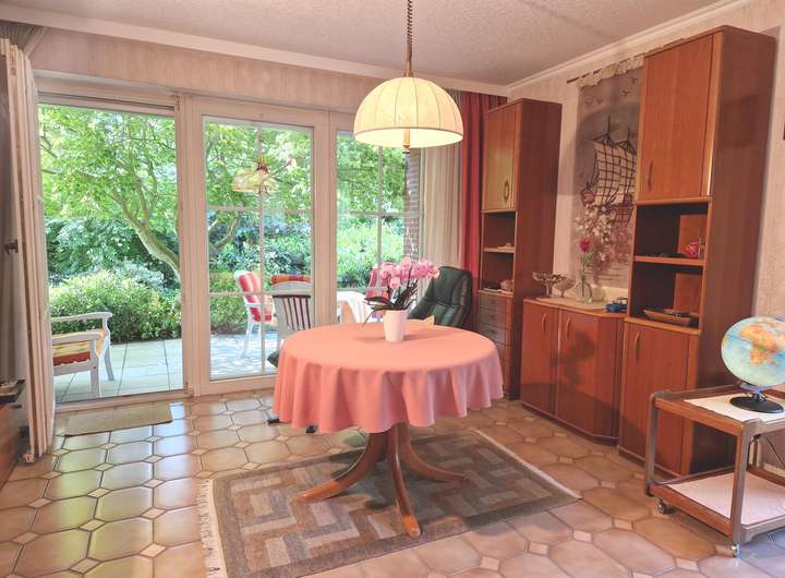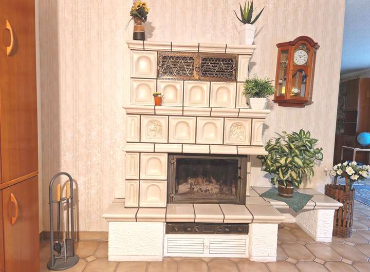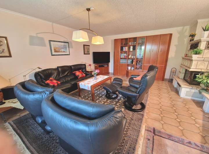 Viel Licht, ein Zugang zum Garten mit teilüberdachter Terrasse und ein gemütlicher Kachel-Kaminofen bilden hier das Herzstück dieser soliden Immobilie.