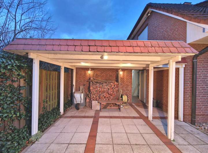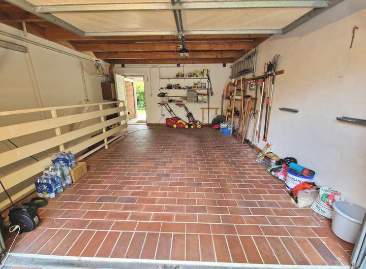 Eine große Garage mit zusätzlichem Keller- und Gartenzugang (überdachte Terrasse) bietet genügend Platz für einen Pkw, Fahrräder, etc.