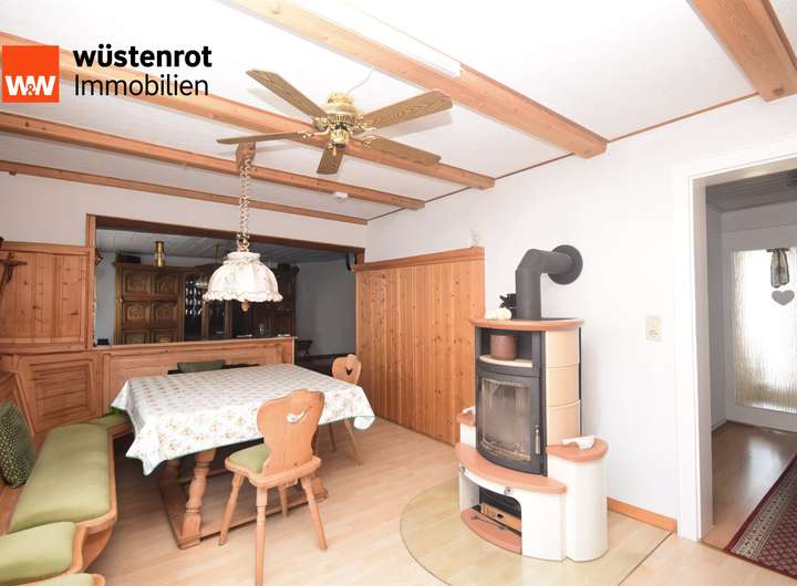 Im Obergeschoss erwartet Sie ein helles Wohnzimmer sowie ein gemütliches Esszimmer mit Holzofen, der für wohlige Wärme und Atmosphäre sorgt.