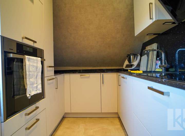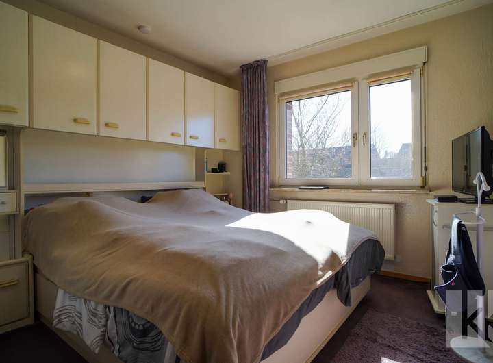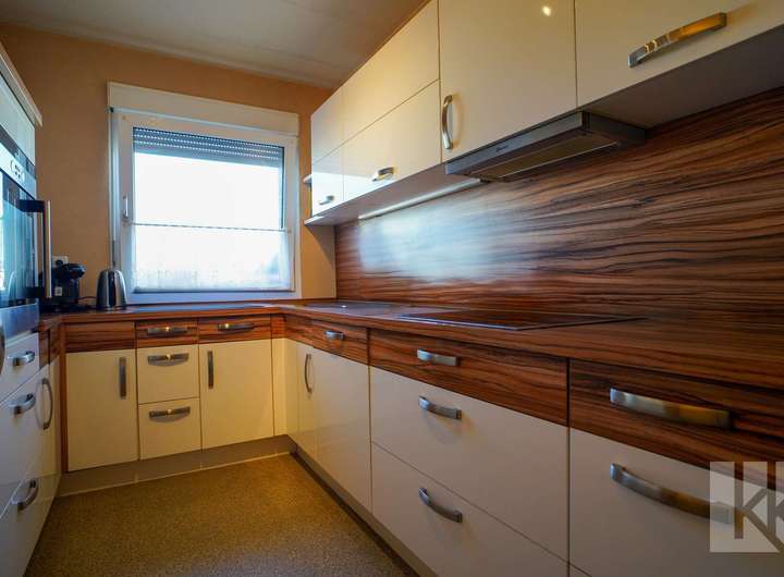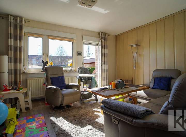 Hier befinden sich die Küche, die mit einer Einbauküche ausgestattet ist, das Badezimmer mit ebenerdiger Dusche, ein Schlafzimmer, ein kleines Büro und das helle Wohnzimmer. Von hieraus gelangt man zur Terrasse und in den pflegeleicht angelegten Garten.
